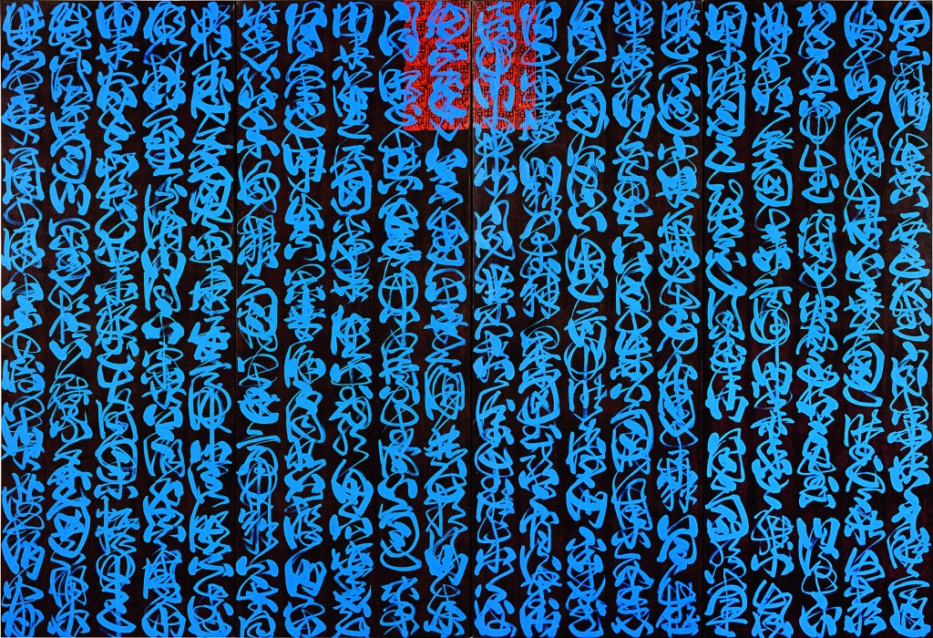 2 Méditations en cobalt, 1997, Fabienne Verdier, (née en 1962) Homage to variations without a theme of Yehudi Menhuin Cobalt Ink, pigments, varnish and cinnabar seals on silk canvas 180 × 260 cm, Paris, musée Cernuschi