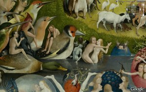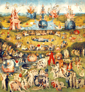 Le plus grand et le plus féerique triptyque de Jérôme Bosch comporte sur le volet gauche le Paradis, souligné par les nuances tendres et claires du vert, du bleu, du jaune et de l’ocre et, sur le volet droit, l’Enfer musical, maintenu dans des couleurs sombres et froides du noir bleuté au gris.