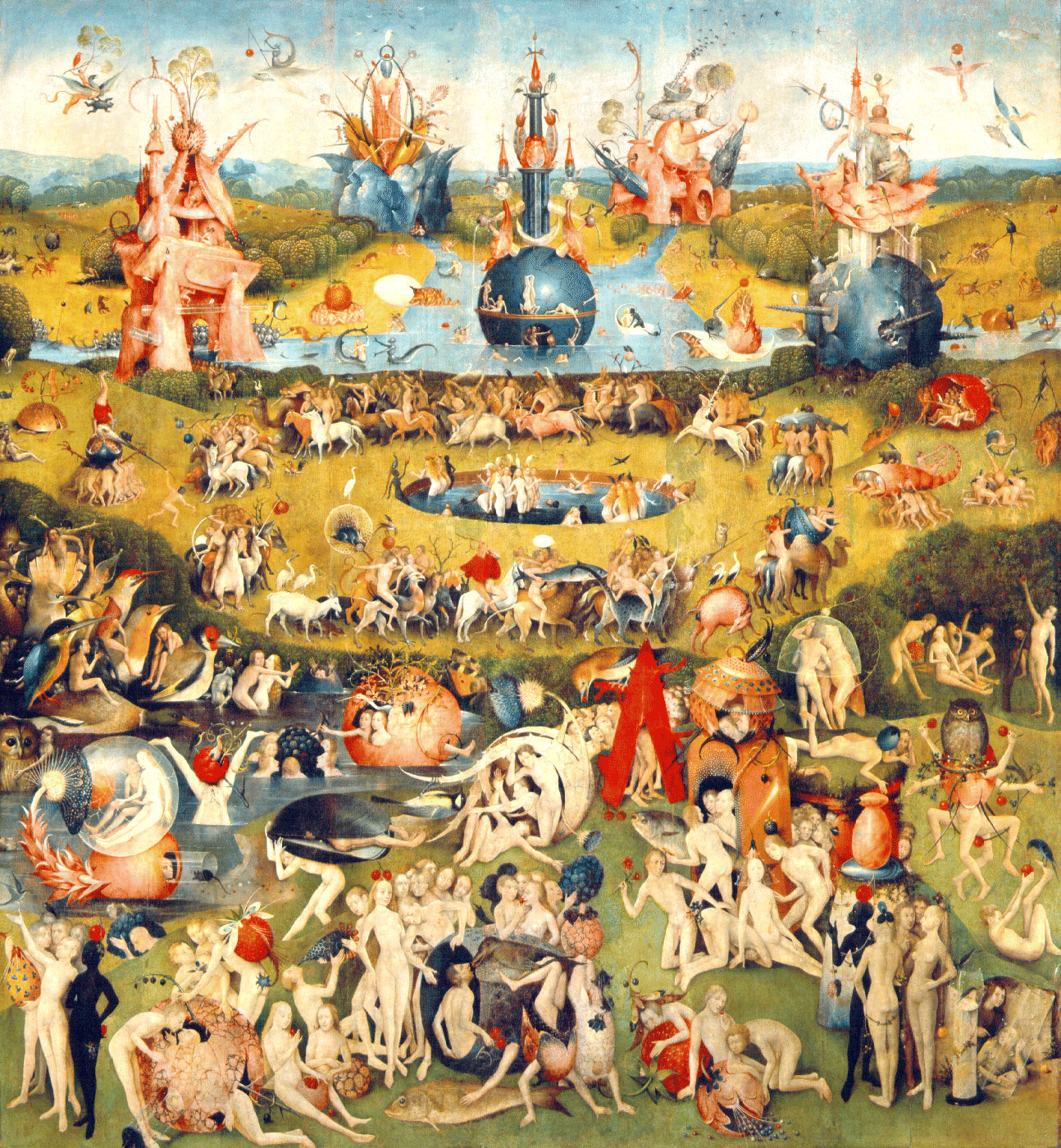 Dans un vaste paysage lumineux, Jérôme Bosch organise la scène en quatre plans concentriques, peuplés de dizaines d’êtres humains nus, d’animaux et de créatures monstrueuses.