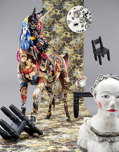 Elle redonne vie à de vieilles tapisseries, des canevas désuets et très Kitch qu’elle transforme en objets d’art, sculptures, mobilier, costumes.