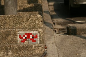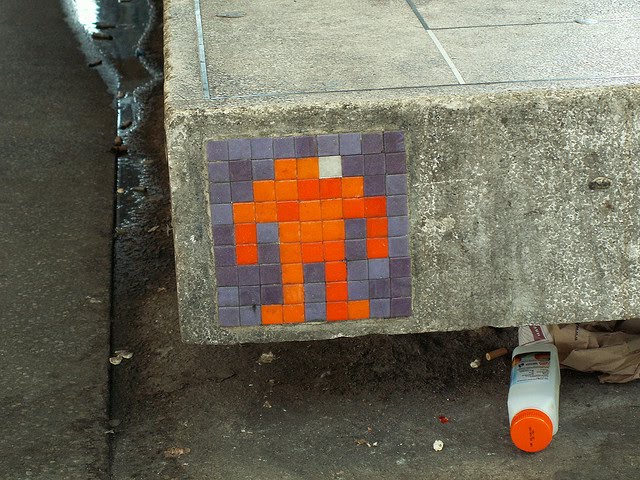 Les mosaïques de cet artiste français anonyme -figure majeure du mouvement street art-, mi-vaisseaux, mi-visages, inspirées de jeux vidéo des années 70/80 se sont immiscées peu à peu depuis la toute fin des années 90 dans les interstices de l’espace urbain ou péri-urbain de capitales ou de mégalopoles dans le monde entier.