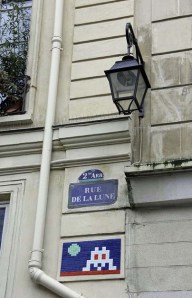 Rue de la lune, je rencontre un petit spécimen des « space invaders » qui ajoute à la poésie du lieu.