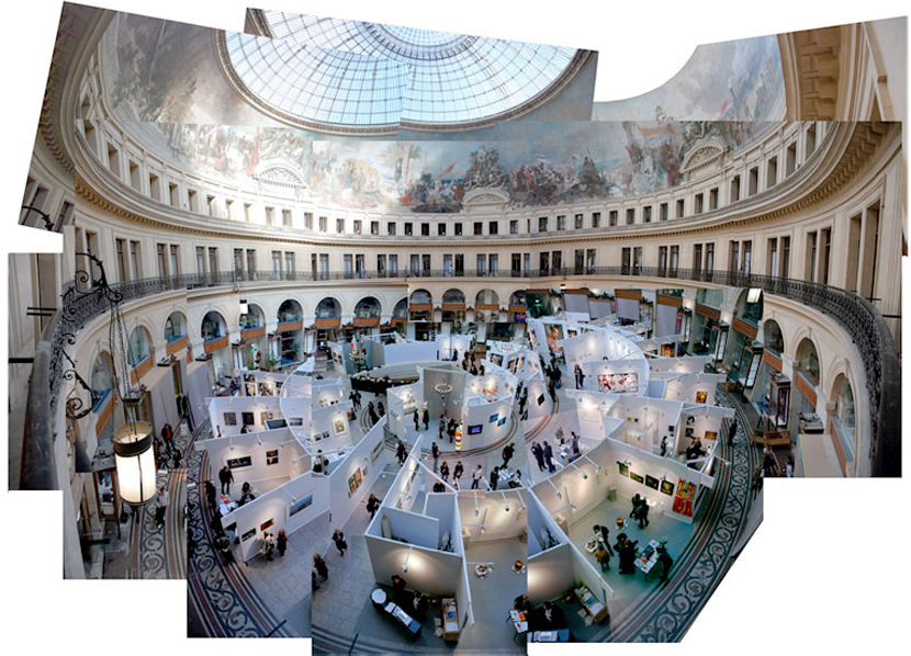 Sous la coupole métallique de la Bourse du commerce de Paris et les fresques du XIXe évoquant l’histoire du commerce entre les cinq continents, je déambule, suivant la rotondité des lieux comme autour d’un stupa. Ambiance festive et décontractée pour la quatrième édition de cette foire d’art contemporain à taille humaine.
