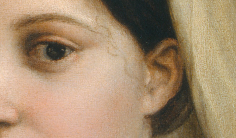 Une observation attentive révèle le pinceau amoureux de Raphaël qui laisse s’échapper une très fine mèche de cheveux ondulant jusqu’au creux d’une oreille coquillage, comme en écho au bouillonnement de l’étoffe précieuse de sa manche.