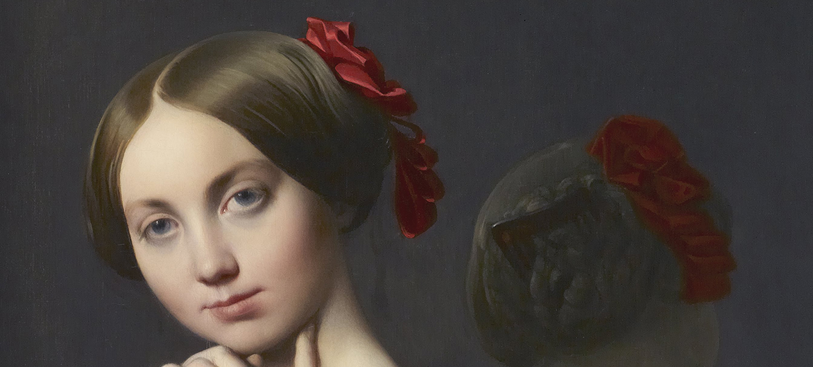 Un miroir reflète le chignon natté retenu par un peigne en écaille et un ruban de satin rouge. On songe à d’autres reflets chez les maîtres de la Renaissance, comme la Femme au miroir (2) du grand Titien, qu’Ingres a pu admirer au Louvre. Et l’on dirait qu’il y a deux tableaux : un portrait savant, avec la claire carnation des épaules, de la gorge et des bras, et dans la profondeur du miroir, le profil perdu, les épaules et la nuque douce, comme une citation de ses Baigneuses de dos (3).