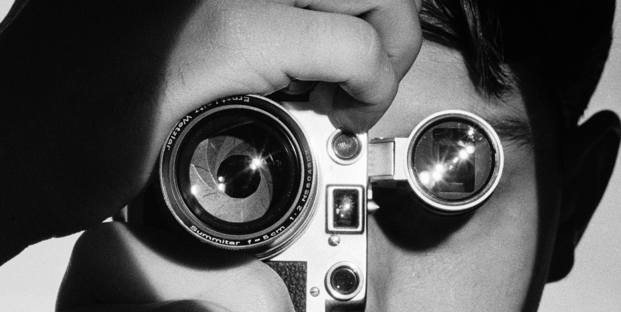 « Photographer Dennis stock holding a camera to his face », 1951, photo by Andreas Feininger (1906-1999) / Time & Life Pictures