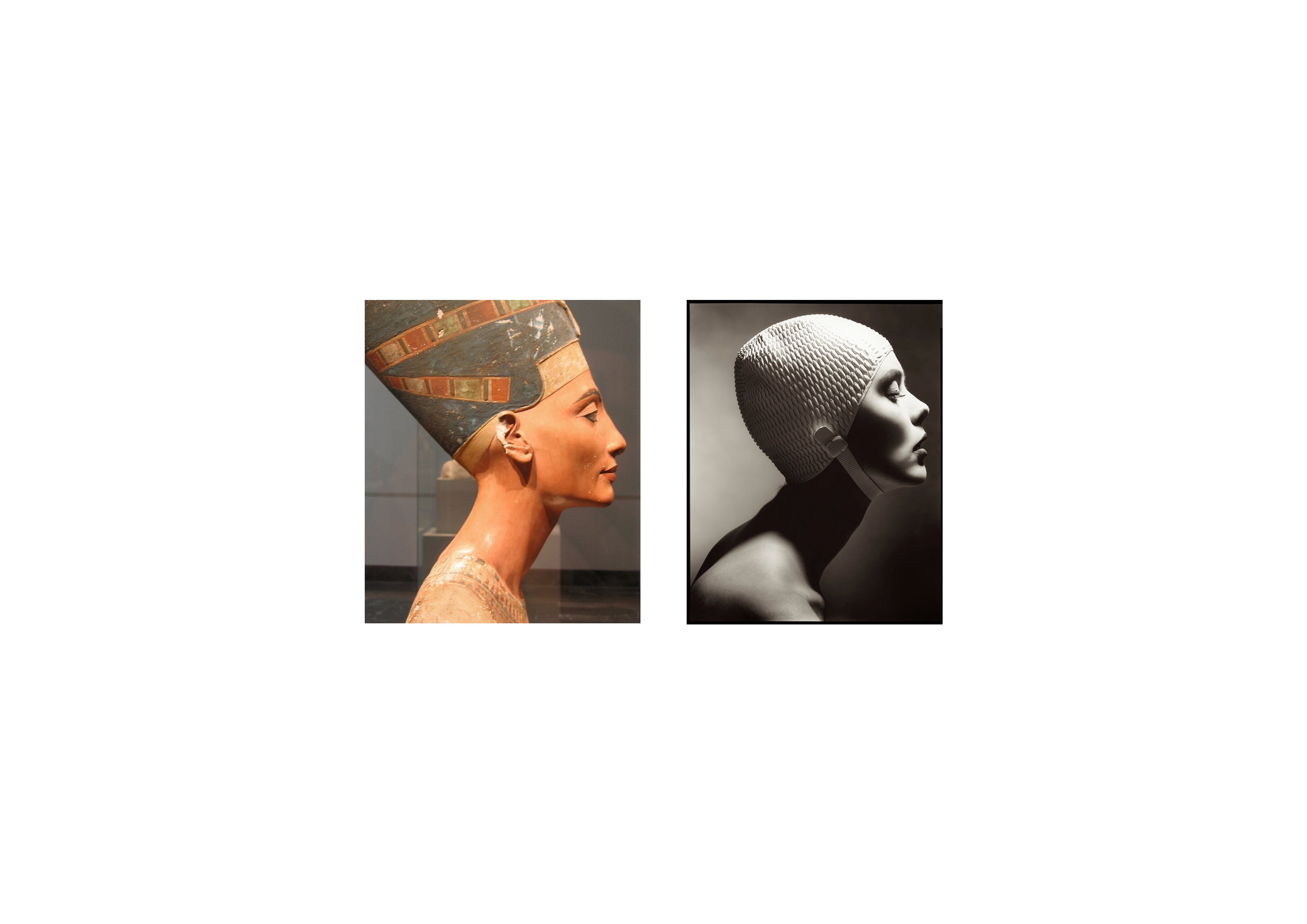 Le premier buste représente Néfertiti, la grande épouse royale d’un des derniers pharaon de la XVIIIe dynastie égyptienne, Amenhotep IV, ou Akhénaton, aujourd’hui exposée au Neues Museum de Berlin. Si elle date bien du XIVe siècle avant Jésus-Christ, cette représentation de Néfertiti – littéralement « la Belle est venue » – avait probablement pour fonction de servir de modèle aux sculpteurs de son temps. Tout comme la jolie baigneuse a servi de modèle au photographe américain Len Prince en 1991.