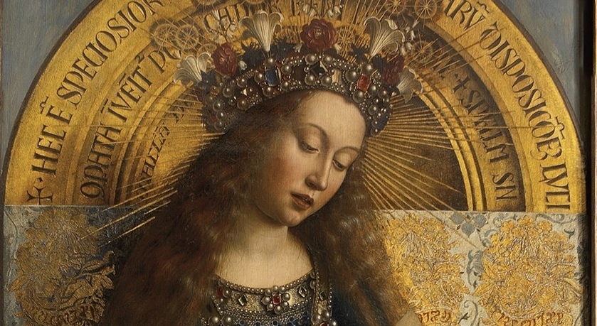 L’Adoration de l’Agneau mystique, vers 1432, la Vierge Marie (un des panneaux centraux), Hubert (1370-1426) et Jan van Eyck (1390-1441), polyptyque peint sur dix panneaux de bois de chêne, 3,75 × 2,60 m (en position fermée) et 3,75 × 5,20 m (ouvert), Gand, cathédrale Saint-Bavon