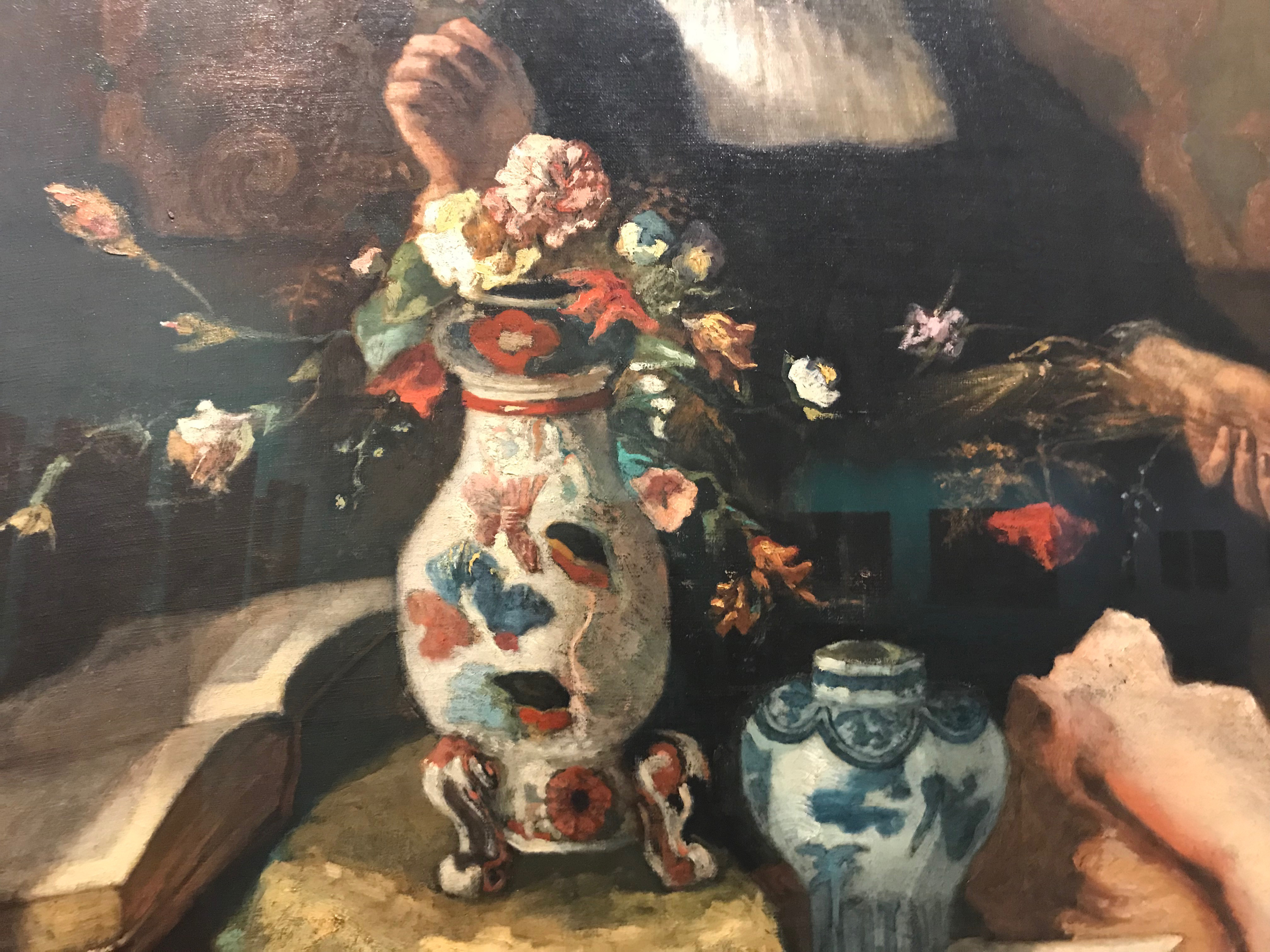 des fleurs fraîches dans un très joli vase en porcelaine qui voisine avec un bleu et blanc chinois adossé à un coquillage géant,