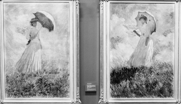 Claude Monet, grand amateur et collectionneur d’estampes nippones, aurait apprécié cette photographie de ses femmes à l’ombrelle contemplées par une japonaise en kimono traditionnel à propos duquel son contemporain et historien d’art Élie Faure écrivait joliment :