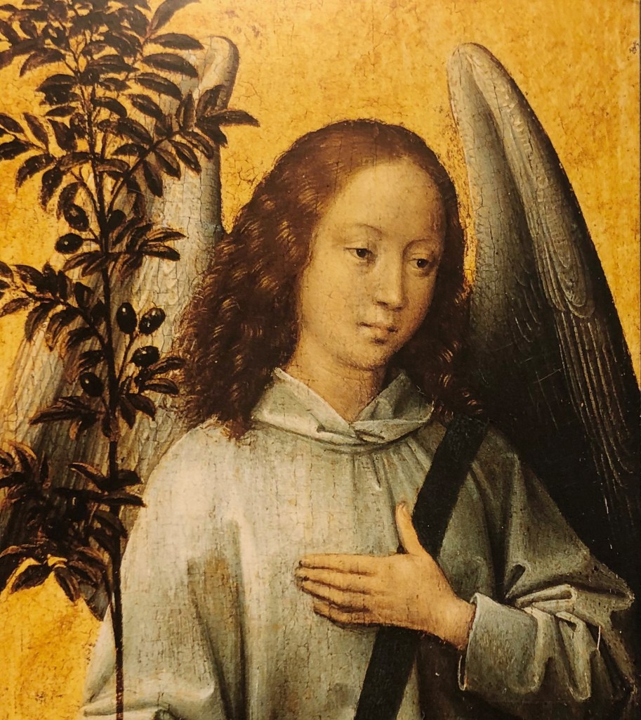 Sarah et l’Ange, même figures sur un fond d’or, mêmes ovales du visage, regards intérieurs, nez droits, lèvres closes sous les ondulations d’une chevelure acajou ; mêmes mains sereinement posées sur des drapés d’étoffes brutes qui sont en eux-même des morceaux de peinture.