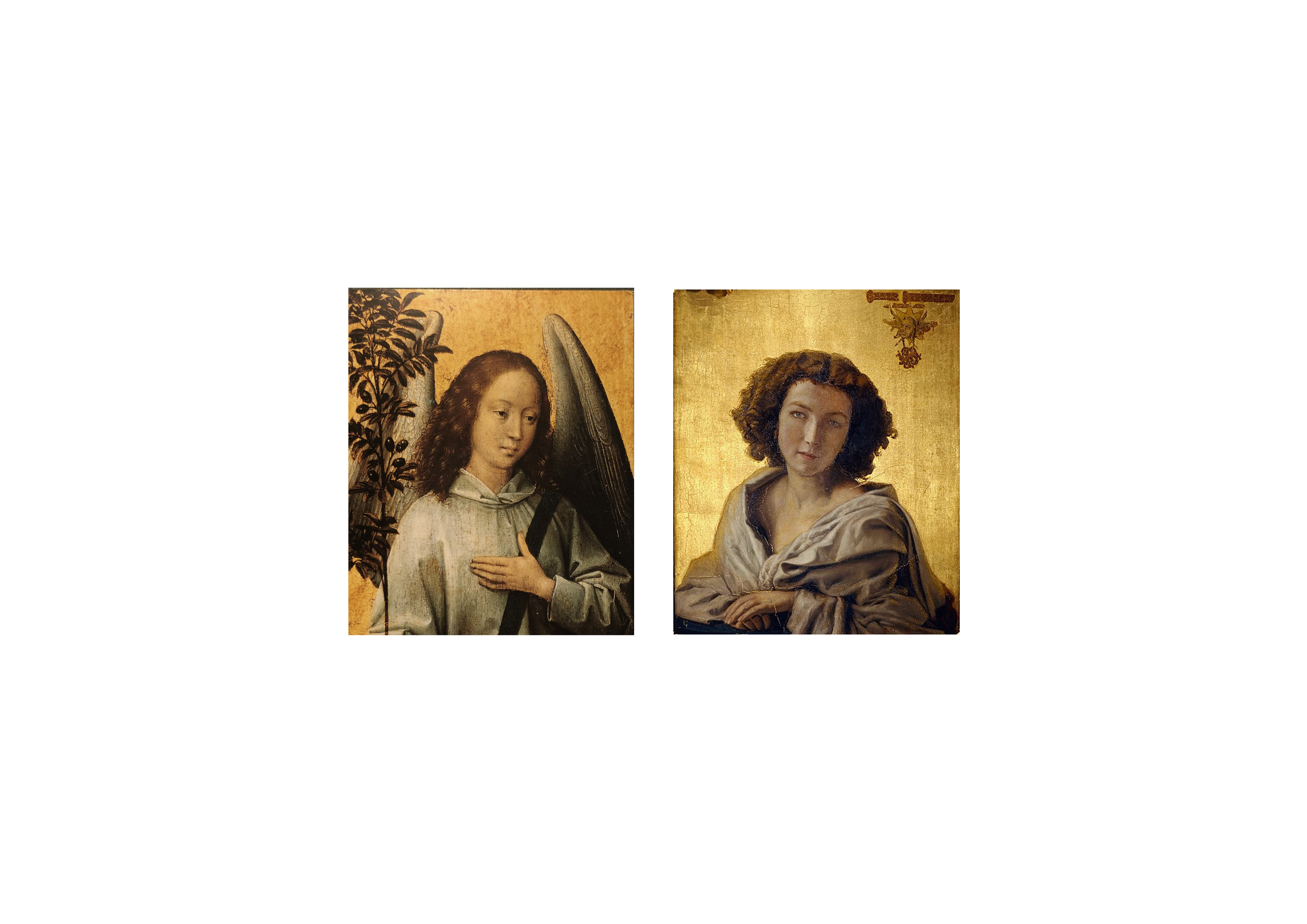 Sarah et l’Ange, même figures sur un fond d’or, mêmes ovales du visage, regards intérieurs, nez droits, lèvres closes sous les ondulations d’une chevelure acajou ; mêmes mains sereinement posées sur des drapés d’étoffes brutes qui sont en eux-même des morceaux de peinture.
