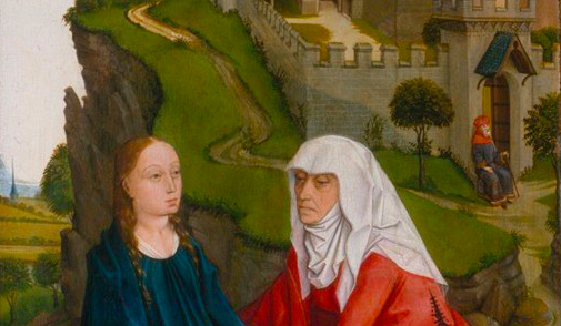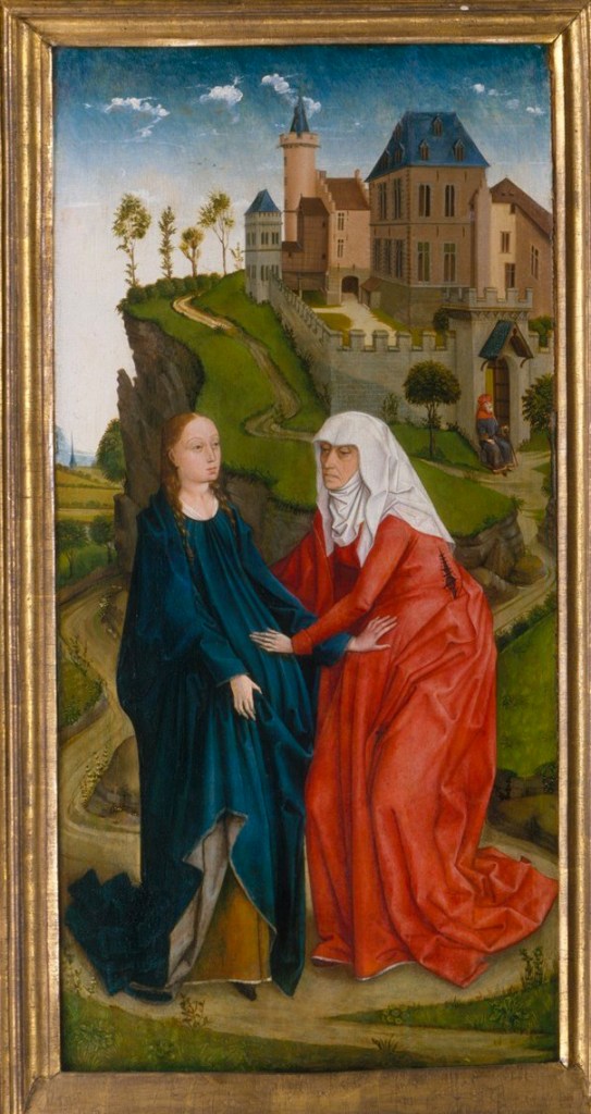 Le détail de Marie et Élizabeth est extrait de la Visitation, elle-même un des panneaux d’un polyptyque du milieu du XVe siècle, de l’Atelier de Rogier van der Weyden (1399-1464), détrempe et huile sur bois, 151,8 X 274,3 X 44,5 cm. Cette œuvre est conservé au Metropolitan Museum of Art.