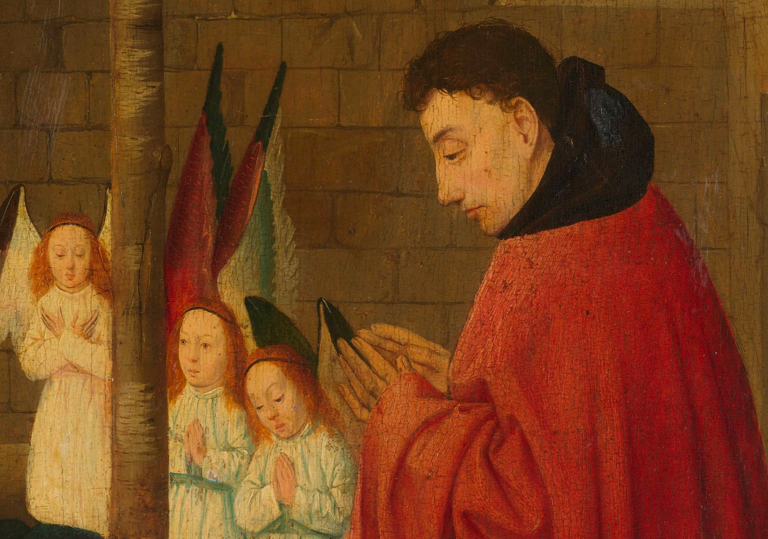Le détail de Joseph est issu de La naissance du Christ, vers 1490-1500, par le Maître de Brunswick (actif vers 1480-1510). Une huile sur bois de 45,3 x 34,8 cm, conservée à Amsterdam, au Rijks museum.