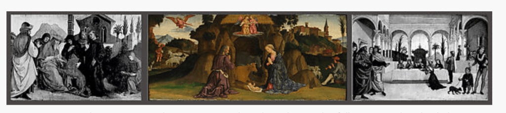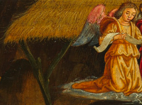 Le détail des anges est issu d’une La Nativité, peinte vers 1482, par Antoniazzo Romano (1435-40-1508). Une détrempe sur bois de 29,2 x 67,3 cm, conservée à New York, au MET.