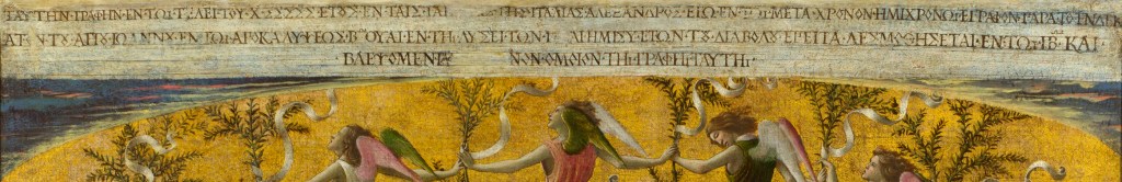 C’est ce que l’on voit dans le haut du tableau, une longue inscription dans un grec approximatif : « Moi Alessandro ai fait ce tableau à la fin de l’an 1500 durant les troubles dont est victime l’Italie, à la moitié du temps après le temps accordé au onzième chapitre de Jean dans le second sceau de l’apocalypse après la disparition du diable pendant trois ans avant qu’il ne soit enchaîné au douzième chapitre [comme il s’est enterré lui-même] ». Ce qui semble assez obscur ! Ces mots renvoient au dernier texte du nouveau Testament, celui de l’Apocalypse de Jean. Quand aux « troubles dont est victime l’Italie », ils sont une référence à la situation religieuse et politique florentine à l’aube du XVIe siècle, avec les évènements tragiques constitués par la descente des troupes de Charles VIII qui envahissent l’Italie, l’exil de Florence de Pierre de Médicis et la prise de pouvoir par le parti de Girolamo Savonarola — frère dominicain, prédicateur et réformateur italien, qui institua et dirigea une terrible dictature théocratique à Florence de 1494 à 1498.
