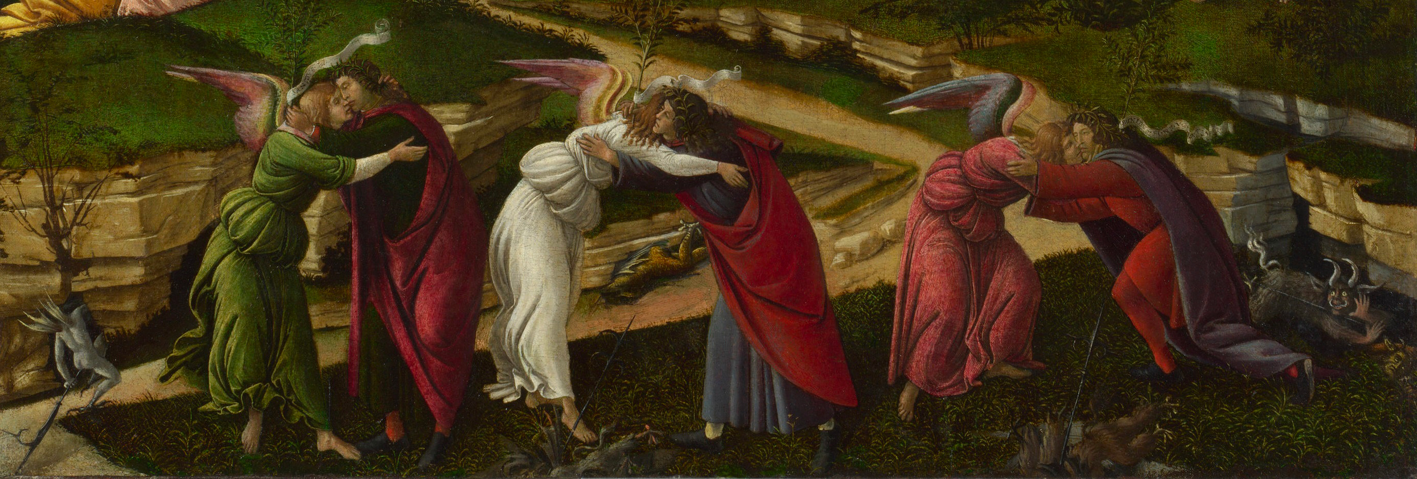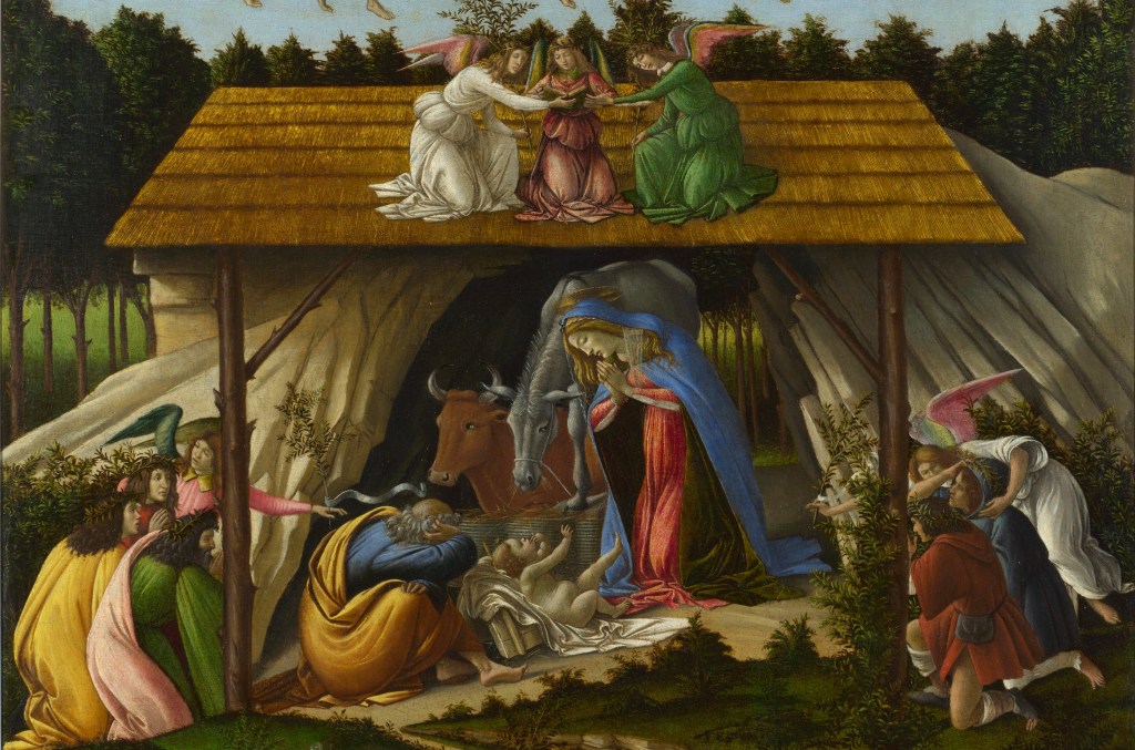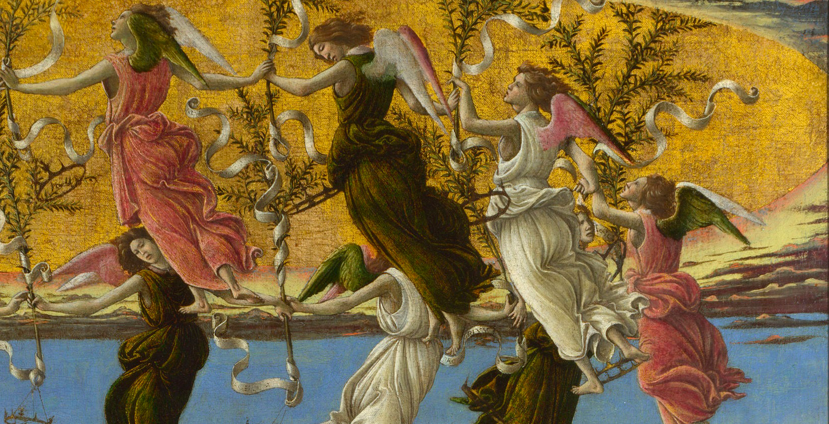 Le détail des anges est issu de La Nativité mystique, peinte entre 1501 et 1505 par Sandro Boticelli (1444-45-1510). Une huile sur toile de 108,5 x 74,9 cm, conservée à Londres, à la National Gallery.