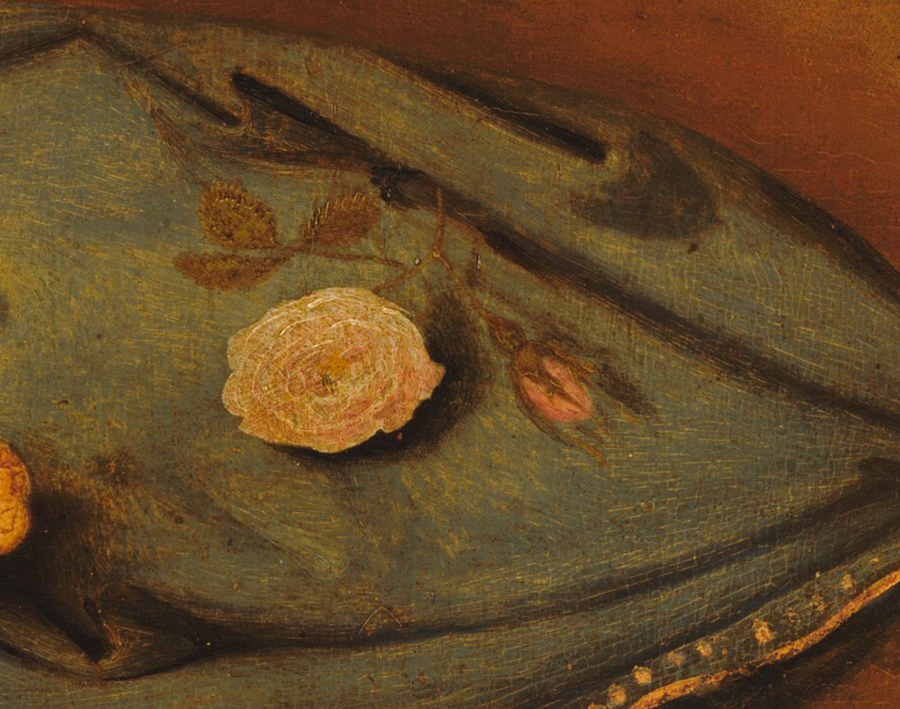 Dans l’art sacré, les symboles revêtent souvent plusieurs significations. La tradition chrétienne voit dans la rose avec ses épines l’image du tourment des martyrs. Sa présence peut se lire comme une allusion à la couronne d’épines du Christ sur la croix. Elle est aussi plus généralement associée à la Vierge Marie. En effet, selon une légende, la rose n’a pas d’épine avant la chute de l’homme, et la Vierge est appelée « rose sans épines » parce qu’elle n’a pas été atteinte par le péché originel.
