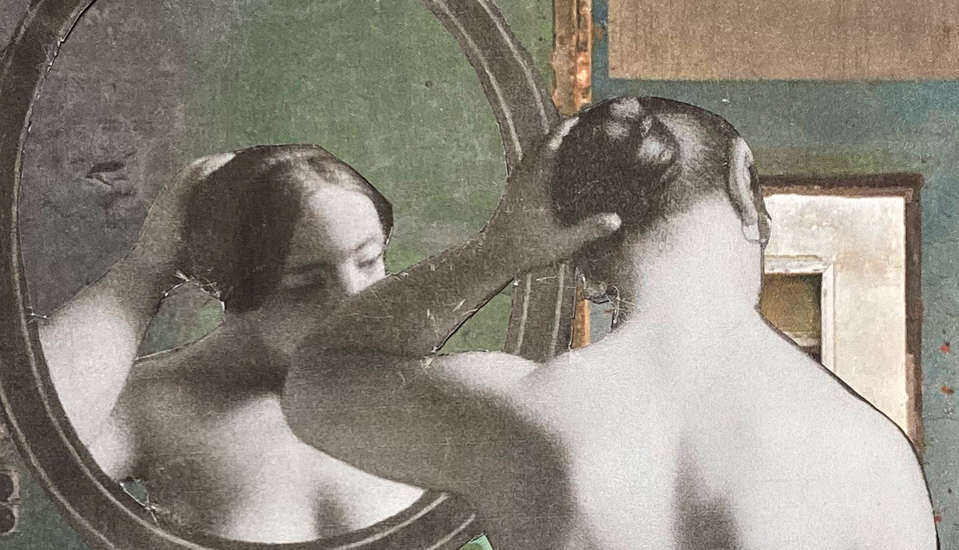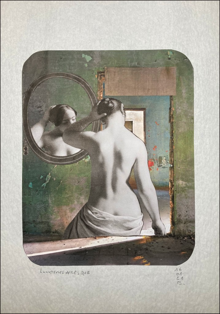 * Longtemps après que, © Barbara Sabaté Montoriol, Collage marouflé sur papier de riz : détail en niveau de gris de Nu de dos (toilette du matin), Christoffer Wilhelm Eckersberg (1783-1853) — une huile sur toile conservée à Copenhague, à la Hirschsprung Collection — & Hotel Petra #6, Beirut, Lebanon, 2010, Photographie de Robert Polidori (canadien, né en 1951).