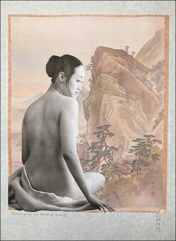 * Le songe de la falaise rouge © Barbara Sabaté Montoriol, Collage marouflé sur papier de riz : détail en niveau de gris de Alice (a), une photographie de Frank Horvat, 1986, Impression jet d’encre pigmentaire, 120 x 78,2 cm
