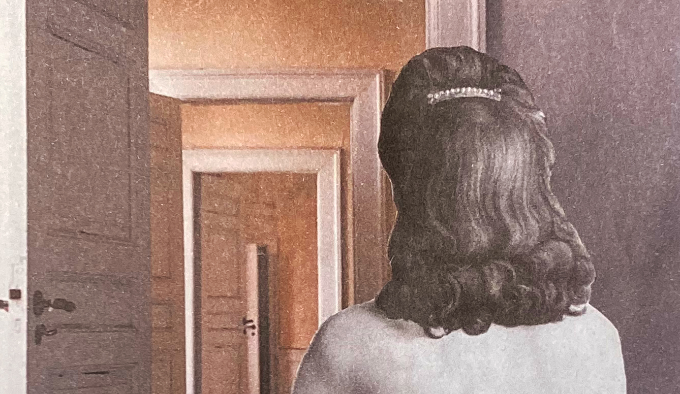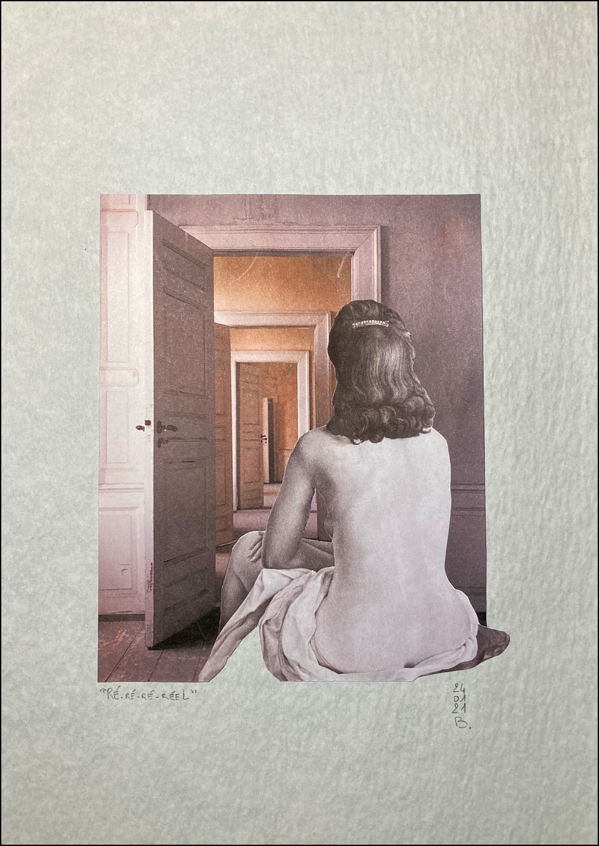 * Ré-ré-ré-réel © Barbara Sabaté Montoriol, Collage marouflé sur papier de riz, le 24 janvier 2021: détail en niveau de gris de Ma femme nue regardant son propre corps devenir marches, trois vertèbres d’une colonne, ciel et architecture, 1945, Salvador Dalí (1904-1989)— une huile sur bois de 61 x 52 cm, Collection privée — & Interior #4, 2008, détail d’une photographie de l’artiste danoise Trine Søndergaard (née en 1972).