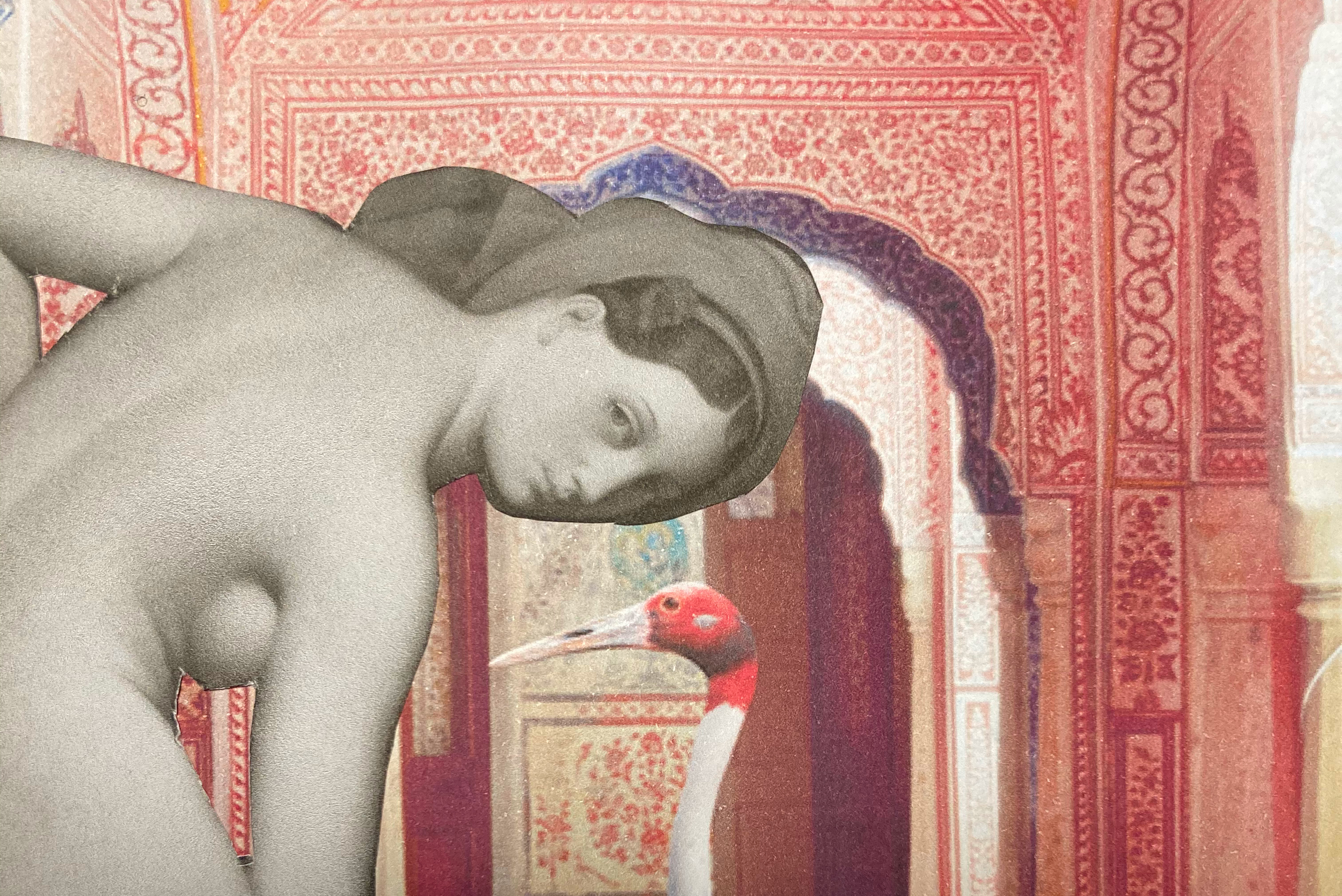 *Escale à Jaipur  © Barbara Sabaté Montoriol, Collage marouflé sur papier de riz : détail de L’Odalisque en Grisaille, vers 1824-34, Atelier de Jean-Auguste Dominique Ingres (1780–1867) — une huile sur toile de 83,2 x 109,2 cm, conservée à New York au MET — & A faithful companion, Samode palace, 2020, India Song 2008 – 2020, détail d’une photographie de l’artiste anglaise Karen Knorr (née en 1954), représentée en France par la galerie Les filles du calvaire.
