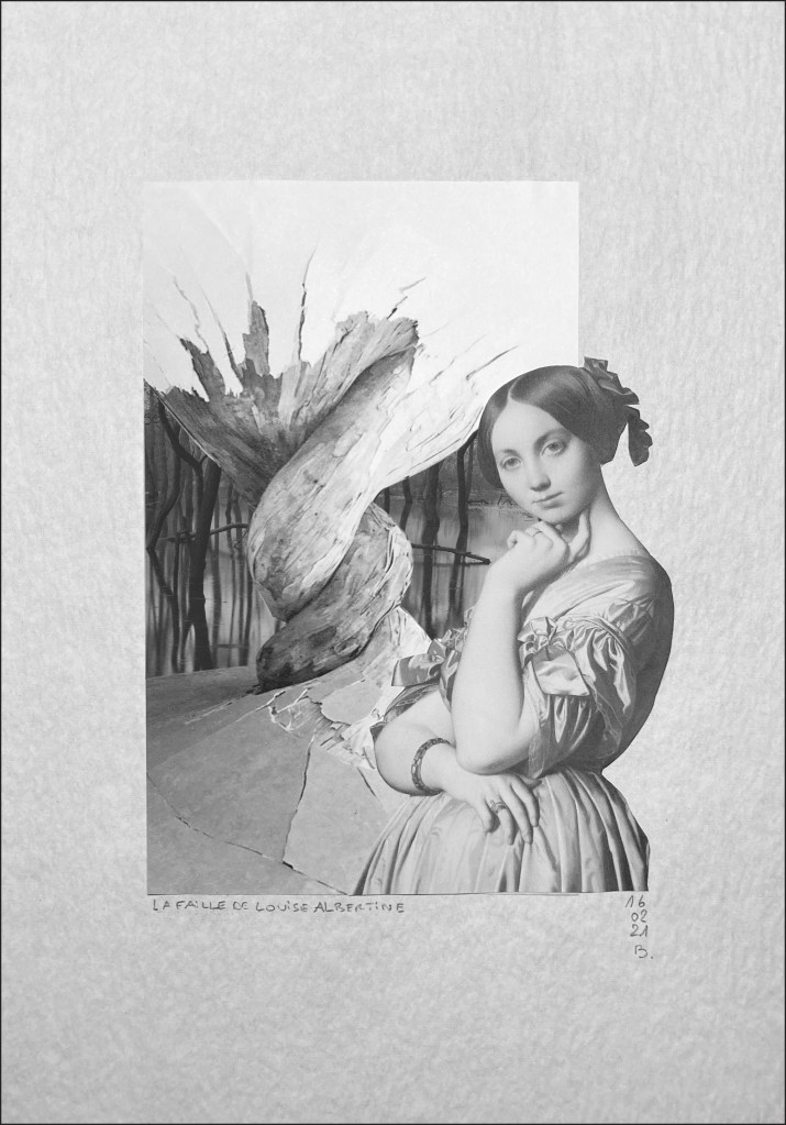 *La faille de Louise Albertine © Barbara Sabaté Montoriol, Collage marouflé sur papier de riz : détail de La Vicomtesse d’Haussonville, 1845, Jean-Auguste-Dominique Ingres (1790-1867), huile sur toile, 126 x 90 cm, NY The Frick collection ; détail de Desnatureza, 2011, œuvre de l’artiste brésilien Henrique Oliveira (né en 1973) & détail de Toyosawa Lake#1, 2009, une photographie de l’artiste Takeshi Shikama.