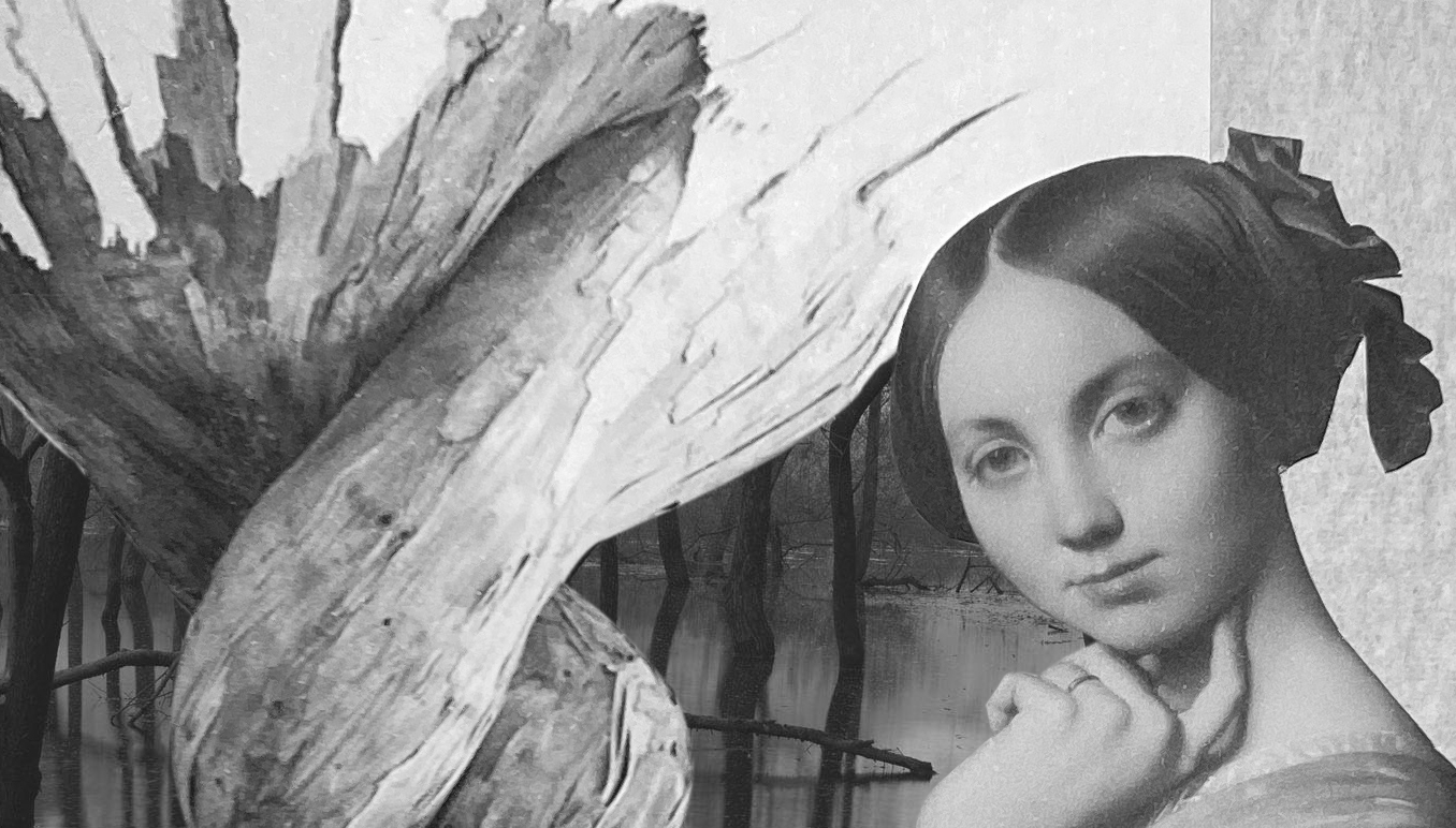 *La faille de Louise Albertine © Barbara Sabaté Montoriol, Collage marouflé sur papier de riz : détail de La Vicomtesse d’Haussonville, 1845, Jean-Auguste-Dominique Ingres (1790-1867), huile sur toile, 126 x 90 cm, NY The Frick collection ; détail de Desnatureza, 2011, œuvre de l’artiste brésilien Henrique Oliveira (né en 1973) & détail de Toyosawa Lake#1, 2009, une photographie de l’artiste Takeshi Shikama.