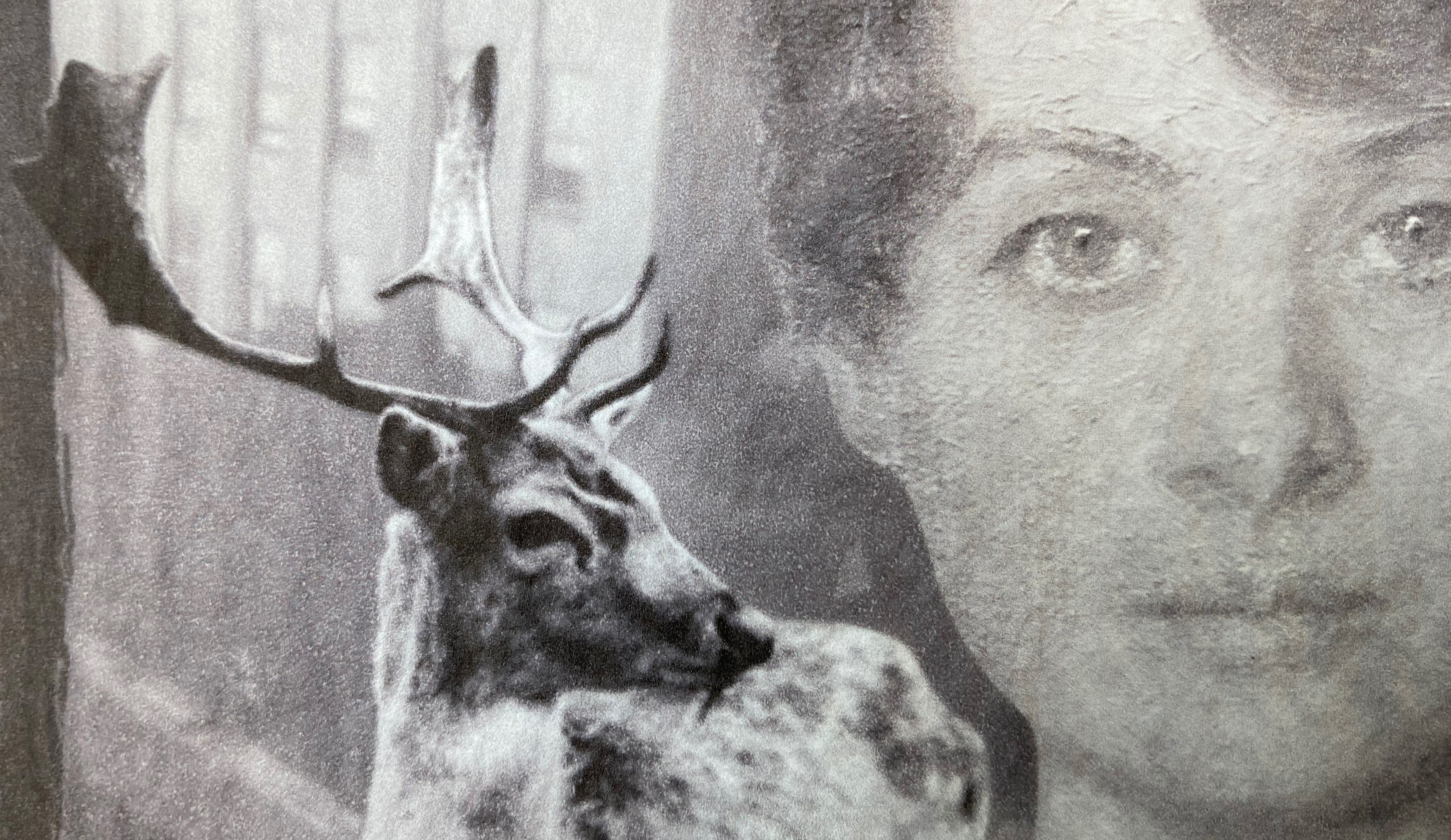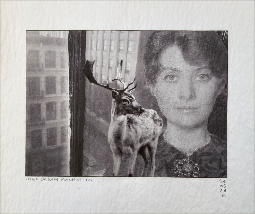 *Deer dream Manhattan © Barbara Sabaté Montoriol, Collage, impression jet d’encre sur papier de riz : détail de “Double portrait de Marie et Peder Severin Kroyer », 1890, une huile sur toile de Peder Severin Kroyer (1851-1909), conservée à Skagen, Skagens Kunsmuseer ; détail d’une photographie de Tony Mendoza – From The Ernie series – Archival inkjet print 17 x 22” & détail de Roe Deer, une photographie de Harry Benson (né en 1929).