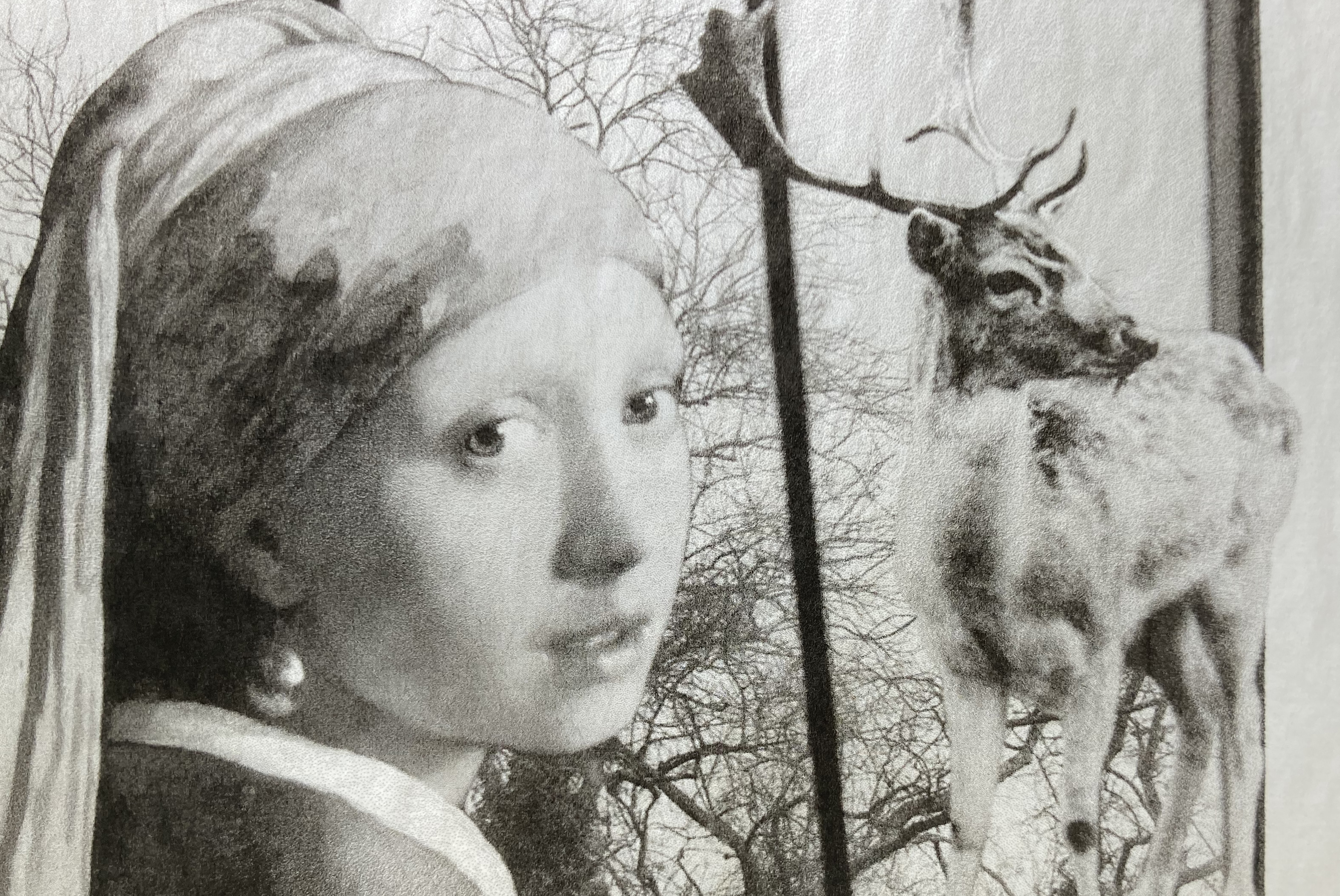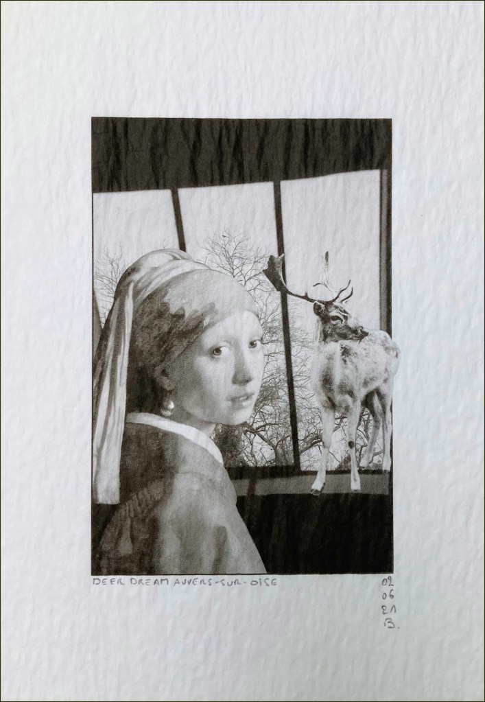 *Deer dream Auvers-sur-Oise © Barbara Sabaté Montoriol, Collage, impression jet d’encre sur papier de riz : détail détourné de “La jeune-fille à la perle », Tronie, vers 1665, Johannes Vermeer (1632-1675), huile sur toile, 44,5 x 39 cm, La Haye, Cabinet royal de peintures, Mauritshuis ; détail d’une photographie de Olivier Verley, « Le grand chassis du grenier », maison Gachet, 8 janvier 2019, & détail de Roe Deer, une photographie de Harry Benson (né en 1929).