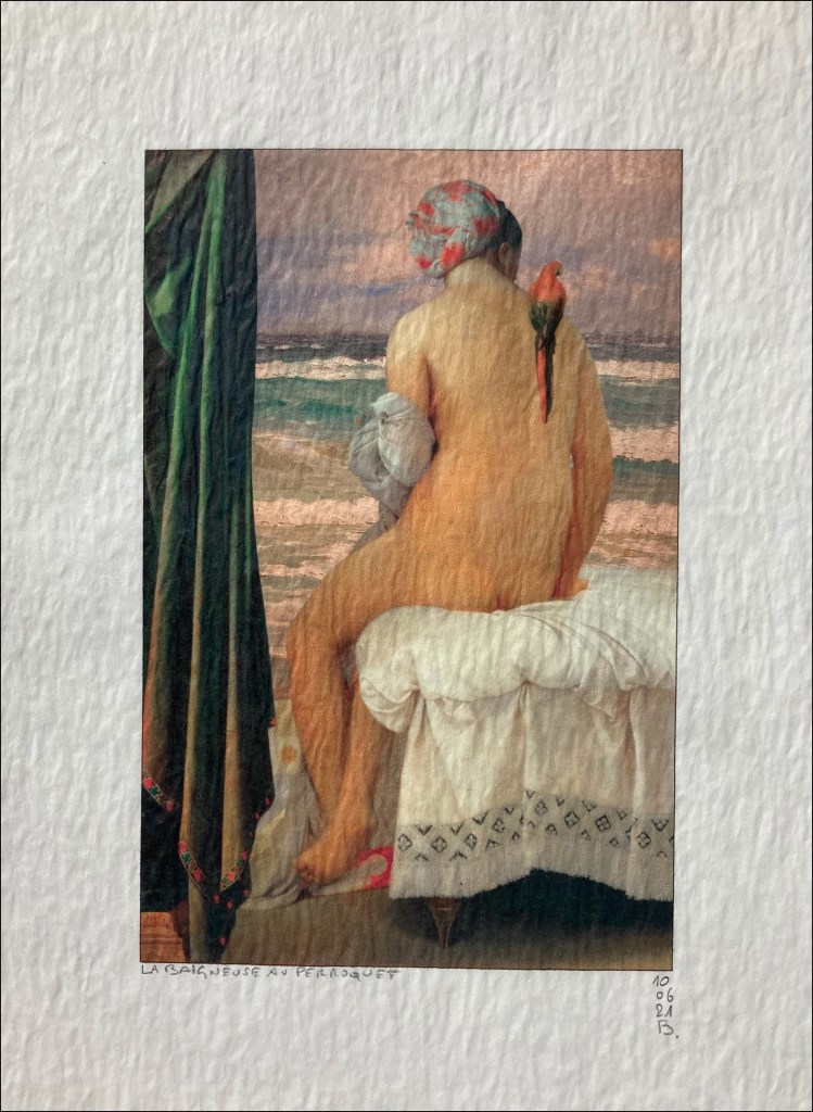 *La baigneuse au perroquet © Barbara Sabaté Montoriol, Collage, série Nude in a landscape, impression jet d’encre sur papier de riz : détail de La baigneuse, dite Baigneuse de Valpinçon, 1808, une huile sur toile de Jean-Auguste-Dominique Ingres (Montauban, 1780 – Paris, 1867), 146 x 97,5 cm, conservée à Paris, au musée du Louvre, détail de Étude de mer, 1885, une huile sur toile de Peder Severin Kroyer (1851-1909), conservée à Skagen, Skagens Kunsmuseer & détail de Études de deux perroquets aras, une huile sur toile de Pieter Boel (Anvers, 1622 – Paris, 1674), 126 x 114 cm, conservée à Paris, au musée du Louvre.