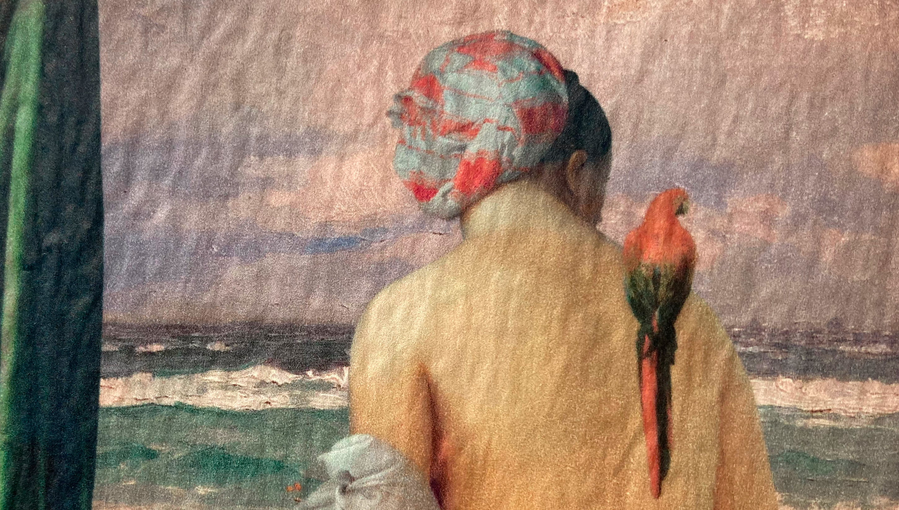 *La baigneuse au perroquet © Barbara Sabaté Montoriol, Collage, série Nude in a landscape, impression jet d’encre sur papier de riz : détail de La baigneuse, dite Baigneuse de Valpinçon, 1808, une huile sur toile de Jean-Auguste-Dominique Ingres (Montauban, 1780 – Paris, 1867), 146 x 97,5 cm, conservée à Paris, au musée du Louvre, détail de Étude de mer, 1885, une huile sur toile de Peder Severin Kroyer (1851-1909), conservée à Skagen, Skagens Kunsmuseer & détail de Études de deux perroquets aras, une huile sur toile de Pieter Boel (Anvers, 1622 – Paris, 1674), 126 x 114 cm, conservée à Paris, au musée du Louvre.