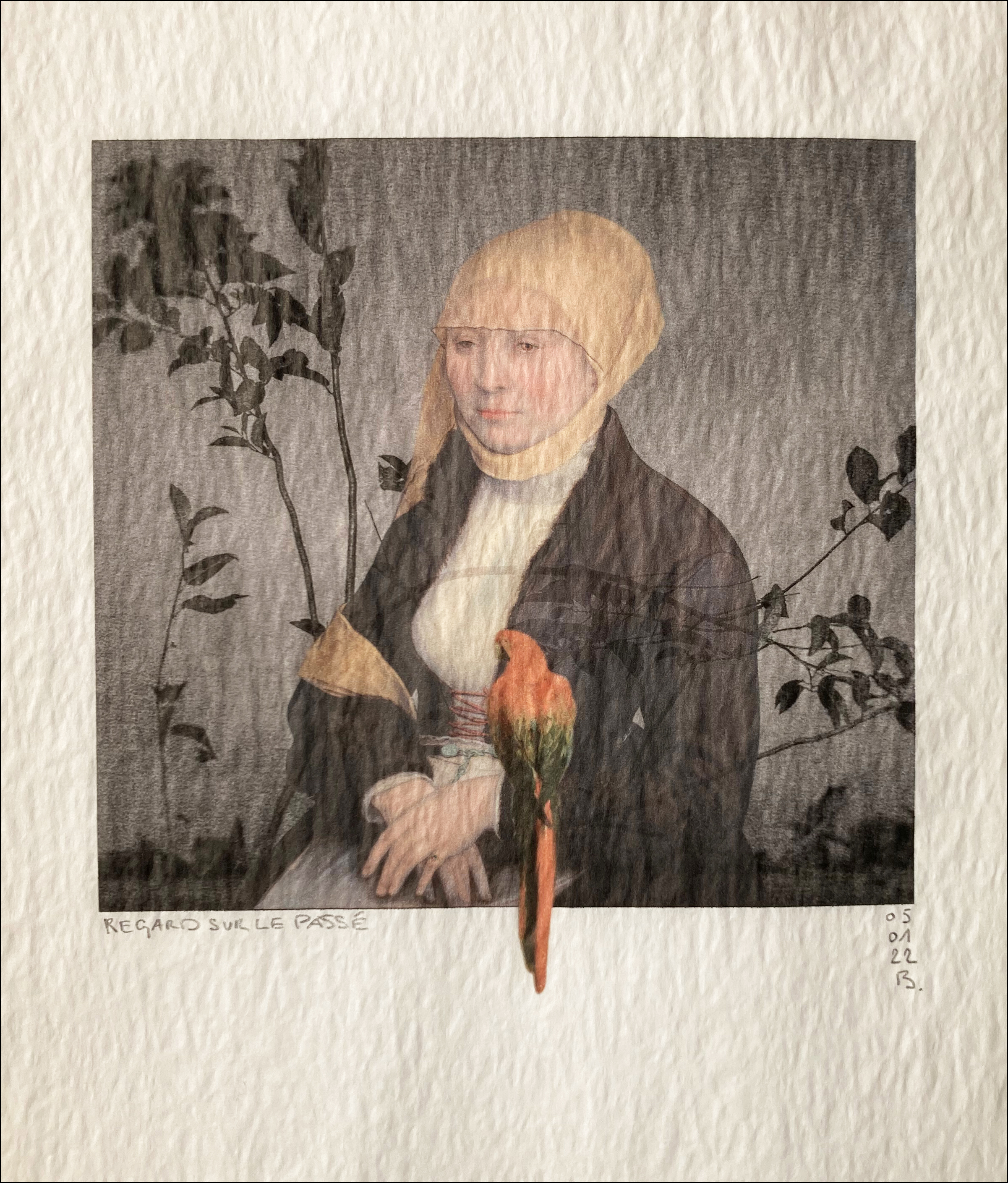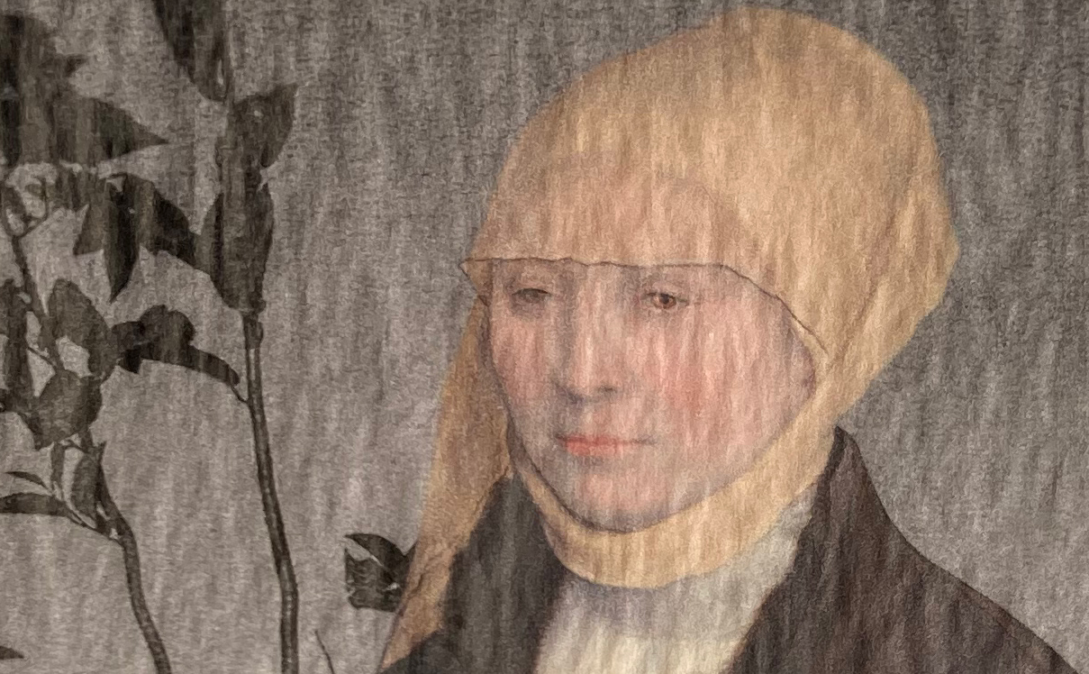 *Détail de Portrait d’une femme d’Allemagne du sud, vers 1520-1525, une huile sur panneau de bois de 34 x 45 cm, attribuée à Hans Holbein le Jeune (vers 1497-1543) et conservée à La Haye, au Mauritshuis Picture Gallery ;