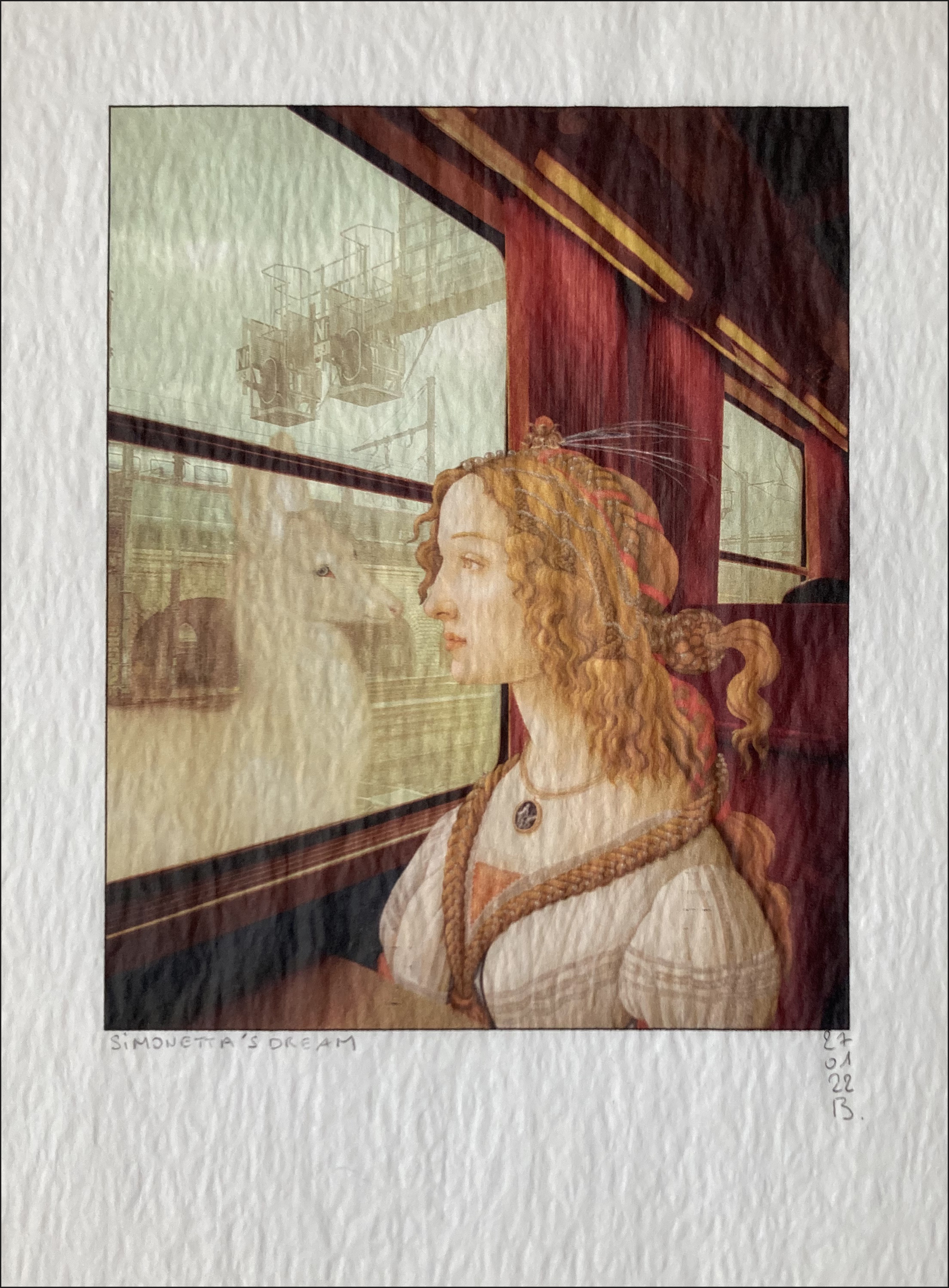 *Détail détourné du portrait de Simonetta Vespucci — tempera sur bois de 82 x 54 cm — peint par Sandro Botticelli (1444-1510) vers 1480-1485 et conservé à Francfort-sur-le-Main, au musée Städel ;