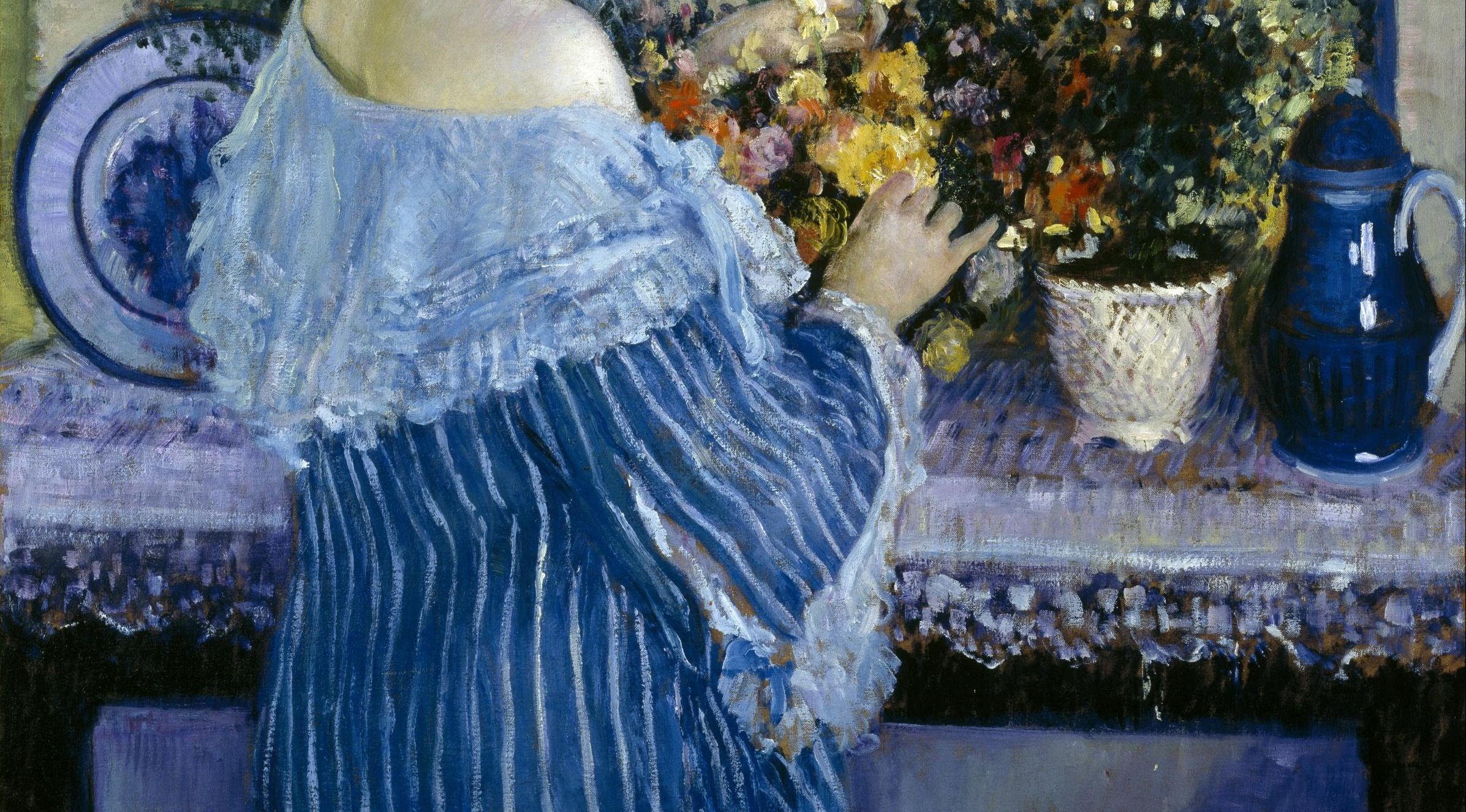 1 Girl in Blue Arranging Flowers, 1915 by Frederick Carl Frieseke (1874-1939), huile sur toile, 81,5 x 81 cm, Houston museum of Fine Arts
