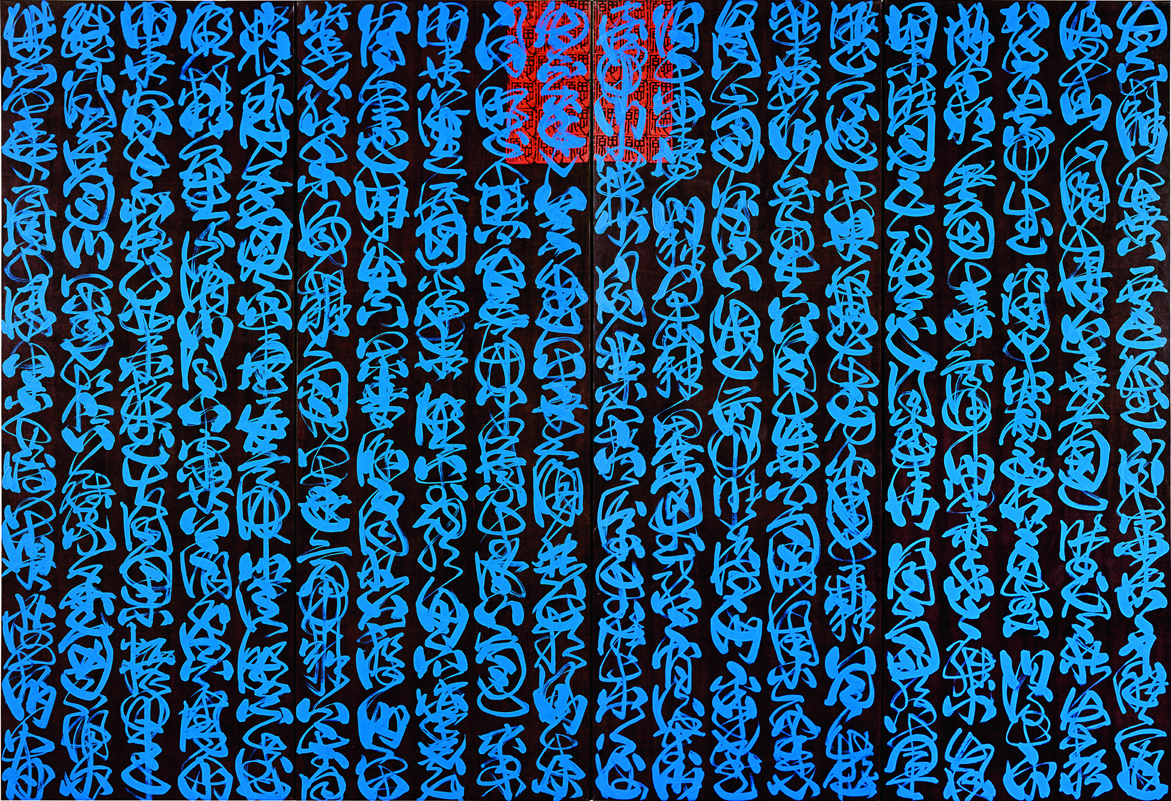 2 Méditations en cobalt, 1997, Fabienne Verdier, (née en 1962) Homage to variations without a theme of Yehudi Menhuin Cobalt Ink, pigments, varnish and cinnabar seals on silk canvas 180 × 260 cm, Paris, musée Cernuschi