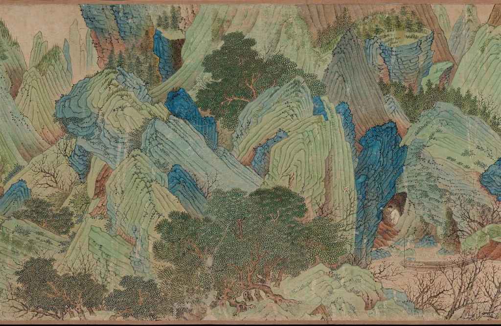 3 La source aux fleurs de pêchers (poème de Tao Qian 365-427), Dynastie Ming (1368-1644), attribué à Qiu Ying (1494-1552), détail d’un rouleau de 33 x 472 cm, encre et couleurs sur papier, Boston, museum of fine Arts.