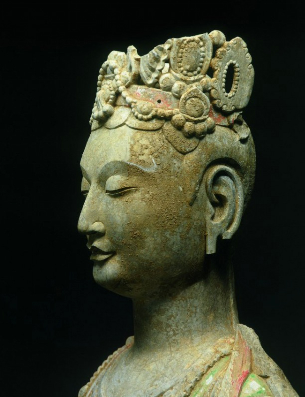 1 Bodhisattva (Les Buddhas du Shandong, découverts lors de fouilles en 1996), Grès avec légères traces de polychromie, époque des Qi du Nord (550-577), Chine, musée de Qingzhou.