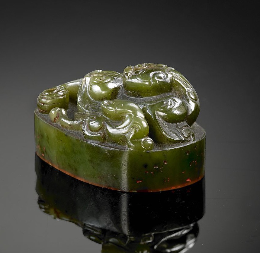 3 Sceau impérial en jade vert épinard sculpté d’un dragon, Chine, dynastie Qing (1644-1912), règne de l’empereur Qianlong (1736-1795), collection privée.