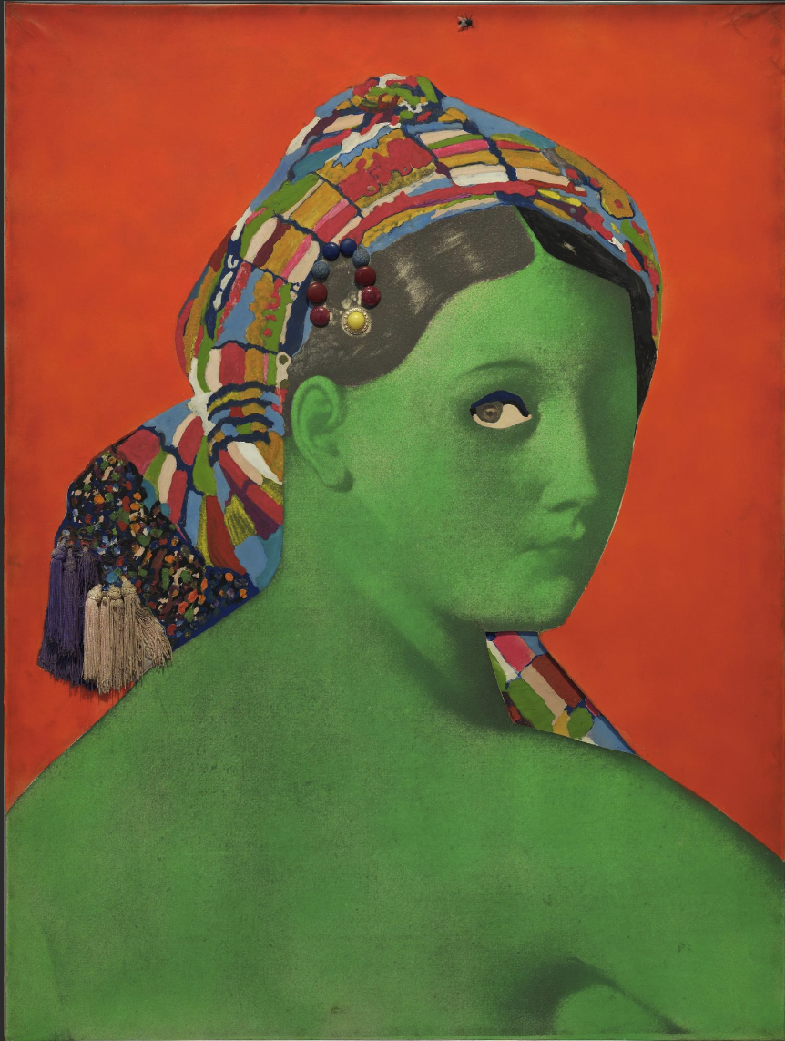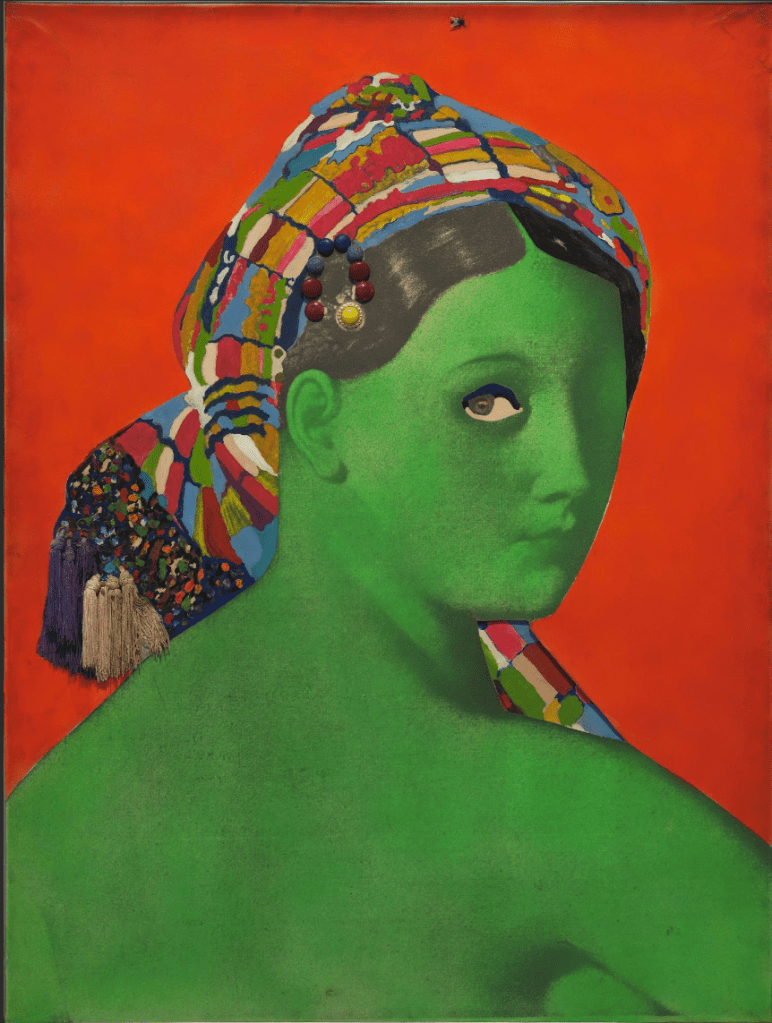 1 Made in Japan – La grande odalisque, 1964, Martial Raysse (1936-2014), peinture acrylique, verre, mouche, passementerie en fibre synthétique, sur photographie marouflée sur toile, 130 x 97 cm, Paris, Centre Pompidou.