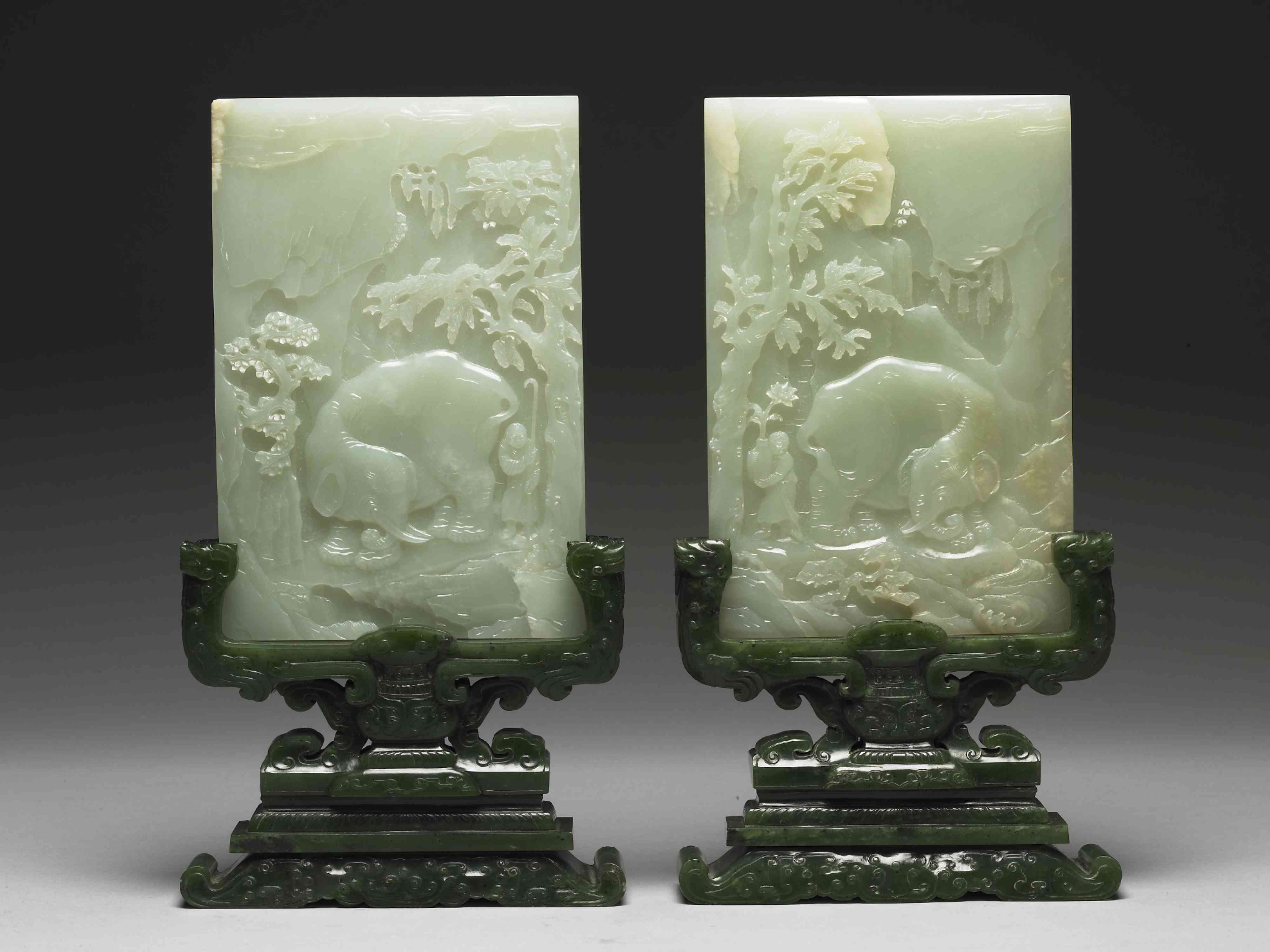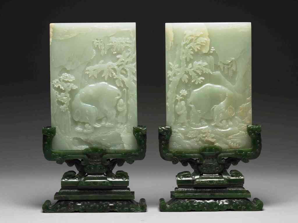 2 Paire d’écrans de table à décor d’éléphant et de prunier en jade, Chine, dynastie Qing (1644-1912), règne de l’empereur Qianlong (1736-1795), Taipei, musée national du Palais.