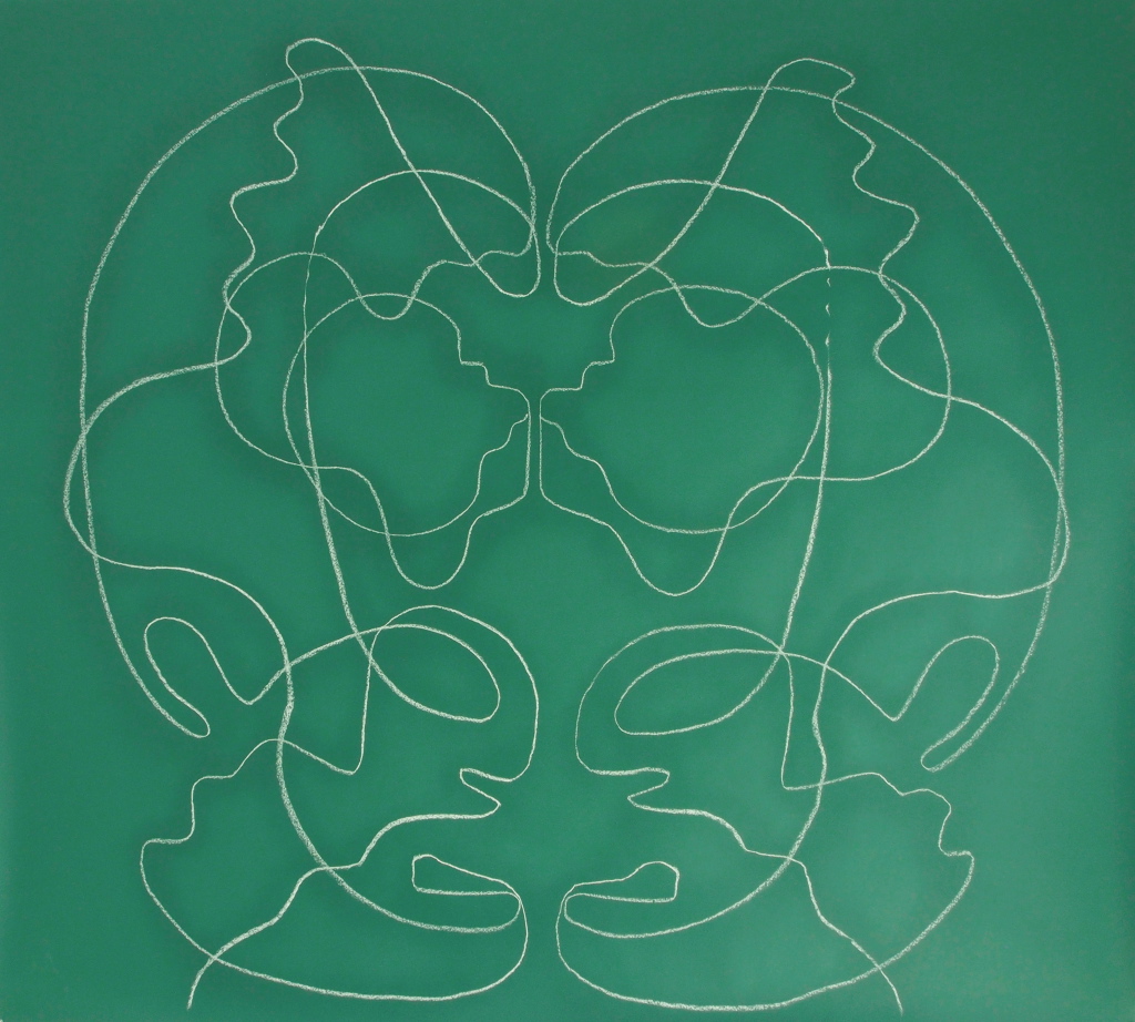 1 Tableau noir, 2016, Muriel Toulemonde (née en 1970), Craie et laque sur fond papier photographique (enregistrement simultané des deux mains), 150 x 135 cm, collection privée.