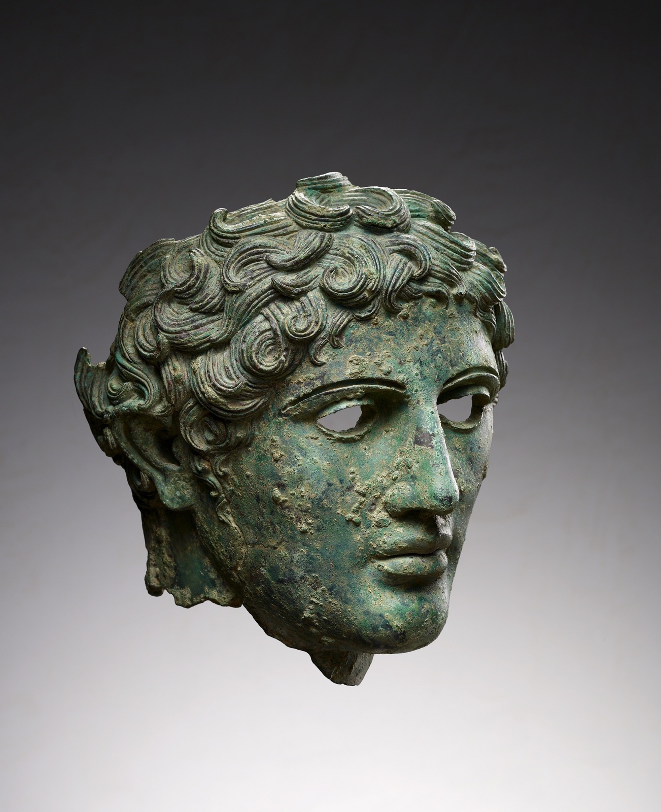 3 Tête virile, Rome, civilisation romaine, Ier siècle av. J.-C. – Ier siècle apr. J.-C., Bronze. H. 24 cm, l. 18 cm, collection privée.
