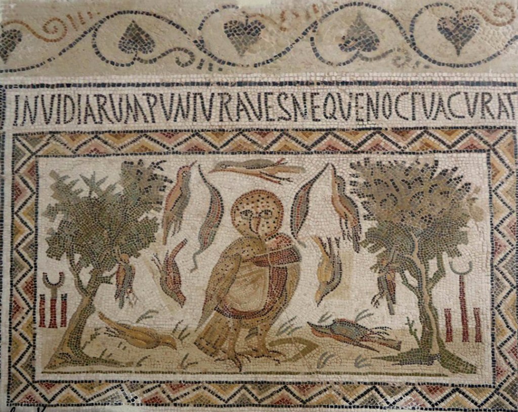 Au musée archéologique d’El Jem, en Tunisie, une mosaïque de l’époque romaine représente une chouette d’une taille exceptionnelle, vêtue d’une toge, l’aile gauche repliée comme un bras, le regard fixe et pénétrant, les serres rivées au sol. Autour d’elle les oiseaux tombent comme des mouches : « Les oiseaux crèvent de jalousie et la chouette n’en a cure », indique l’inscription qui surmonte ce panneau destiné à un seuil.