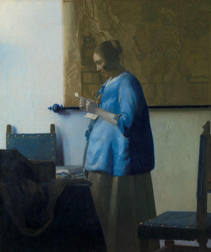 De cette œuvre de Johannes Vermeer aux petites dimensions émane une lumière bleue si douce qu’il est très difficile de s’en détacher. Je me souviens qu’à sa vue, le brouhaha de la grande allée du Rijks museum m’avait semblé comme étouffé par mon émotion.