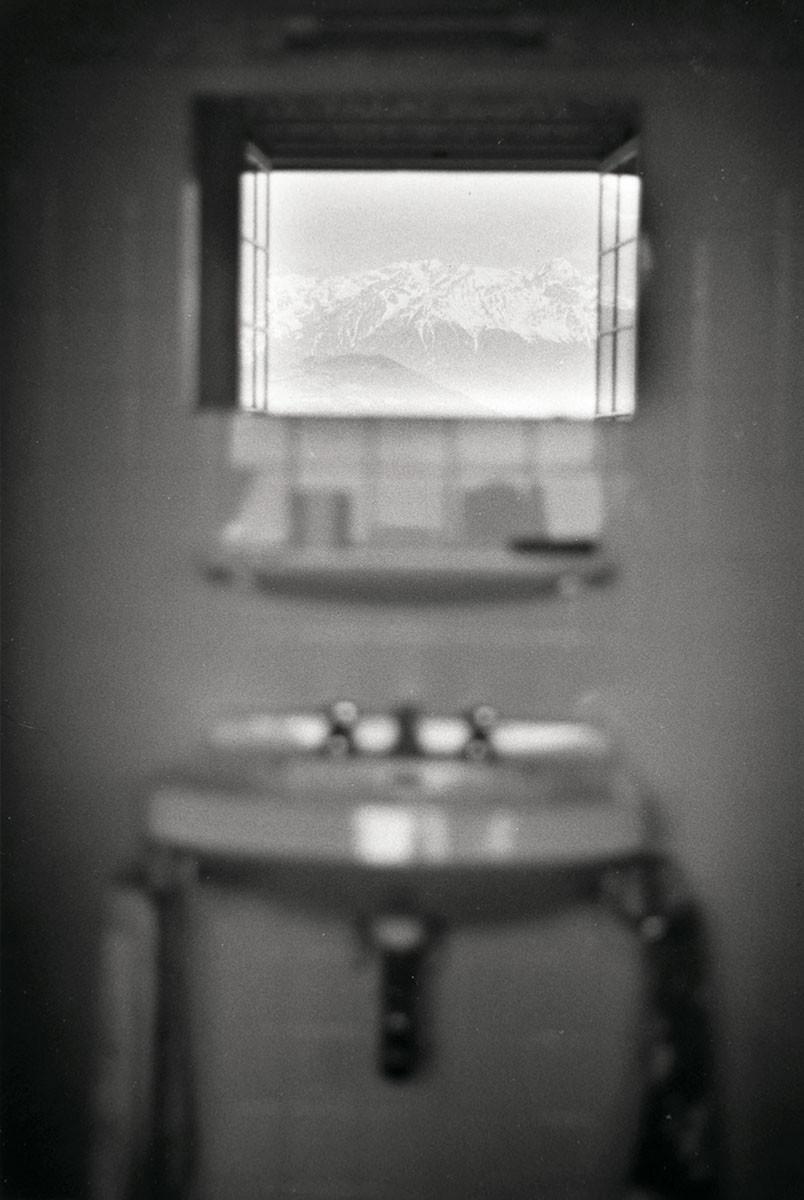 De telle sorte que le résultat — l’image entière — fonctionne comme une capture de l’acte même par lequel une image se dépose, le support du miroir valant ici pour la surface d’impression, dans un bain qui est le temps, et où tout flotte — le lavabo comme la montagne — et d’autant plus mystérieusement que le photographe, qui devrait lui aussi être reflété dans ce miroir qui lui fait face, n’y apparaît pas.