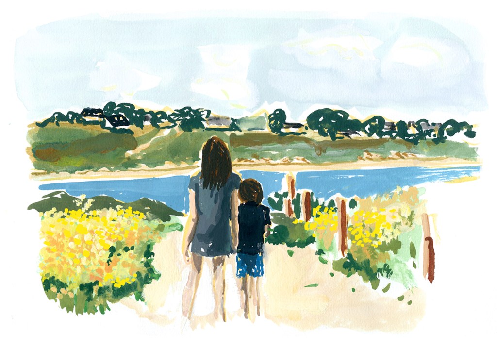 Reprendre la mer où s’allonge une langue de sable doré à la proue de la très grande plage. Rejoindre la grande terre au Nord, sous sa frange de nuées légères.