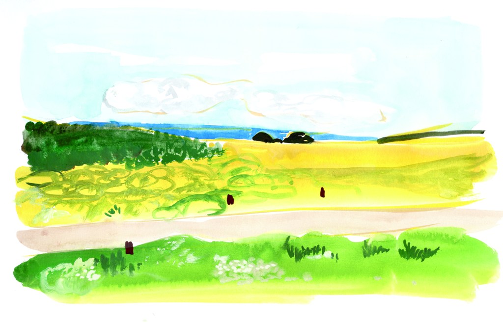 L’odeur d’herbes chaudes monte des dunes.