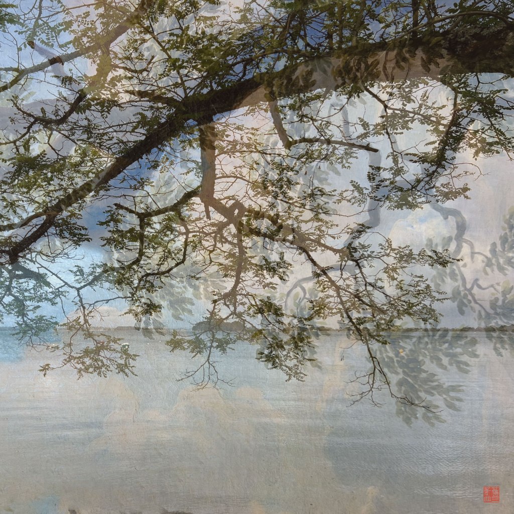 D’un côté, une photographie de la série Les 36 vues de la petite mer où deux branches se mêlent, l’une saisie sur un rivage de l’île-aux-Moines un matin de printemps, l’autre le détail d’un paysage de Nicolaes Jacobsz van der Heck (1595– 1649), peintre hollandais de l’âge d’or, capturé sur les cimaises du musée Fabre à Montpellier.