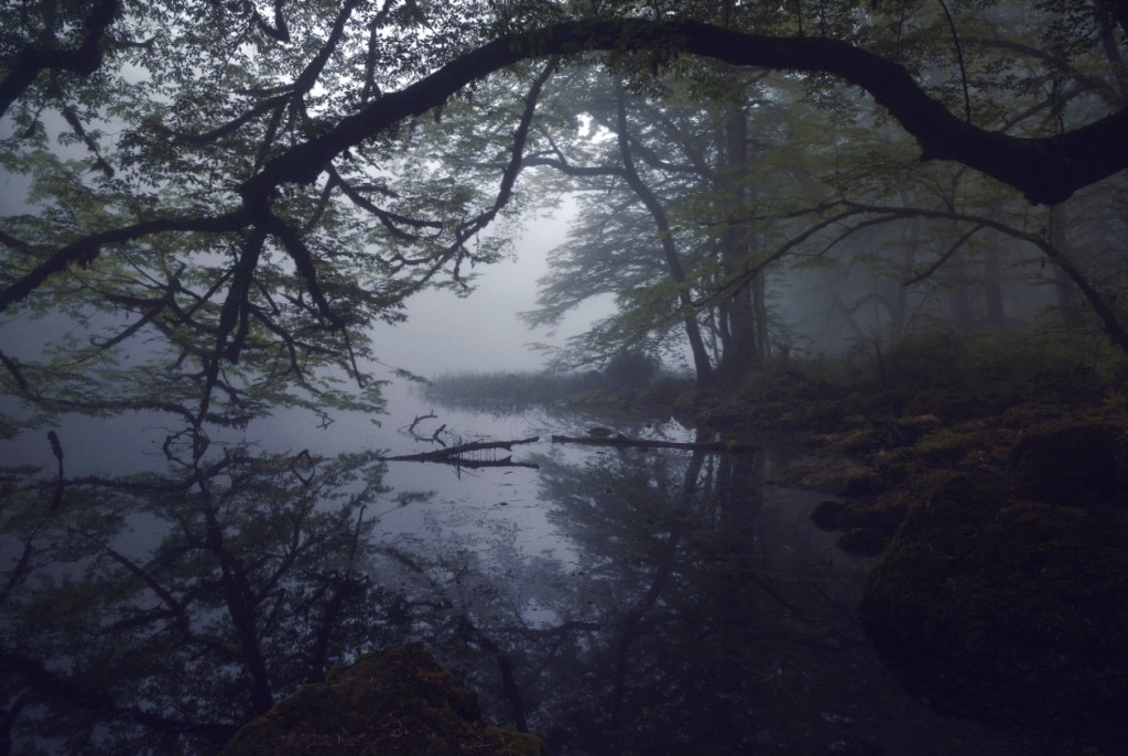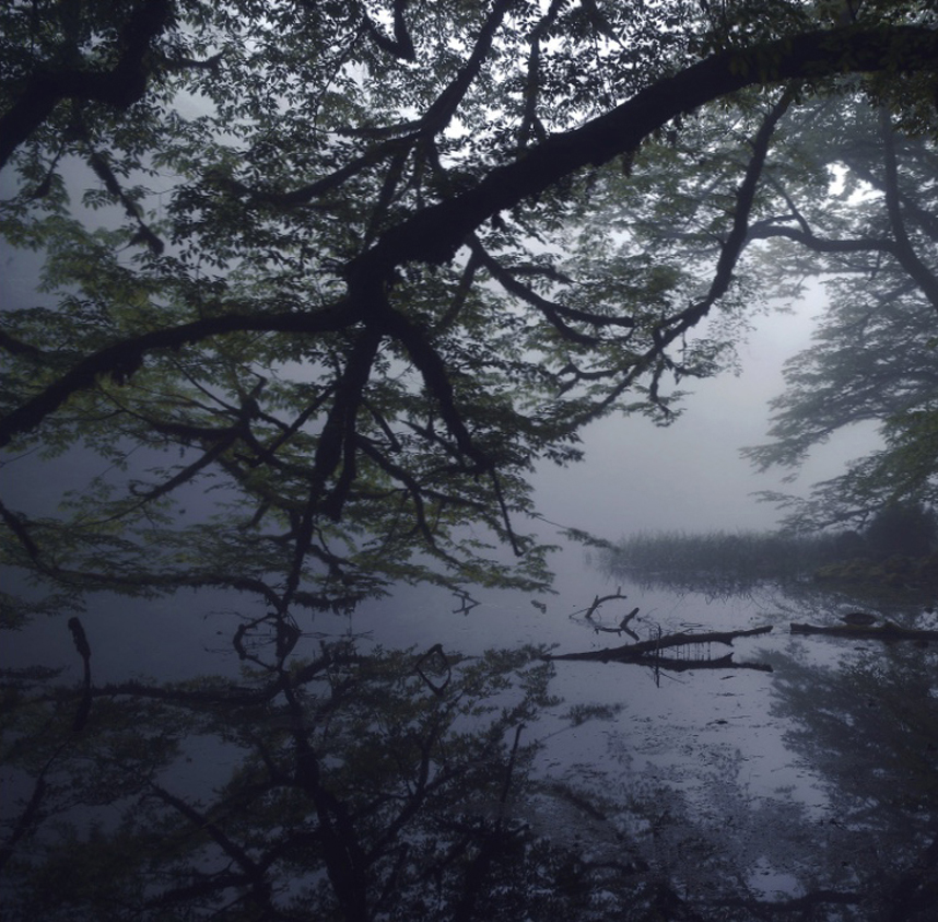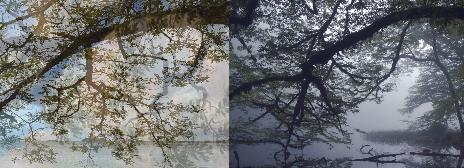 De l’autre une photographie de la série Terre de rêves égarés de Mehran Naghshbandi où une branche jumelle se mire dans l’eau grise d’une forêt noyée de brume.